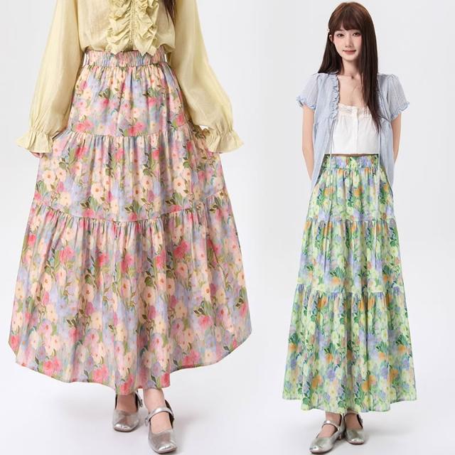 Seven七- .韓系浪漫油畫碎花半身裙女春夏高腰顯瘦A字中長款傘裙蛋糕裙