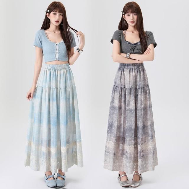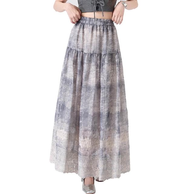 Seven七- .重工刺繡棉麻水墨畫半身裙女春夏高腰顯瘦A字中長款蛋糕長裙