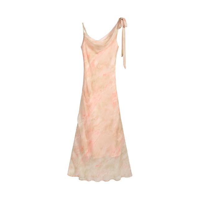 Seven七- .2026春夏新款度假風蕩領雪紡印花吊帶連衣裙女飄帶包臀裙長裙
