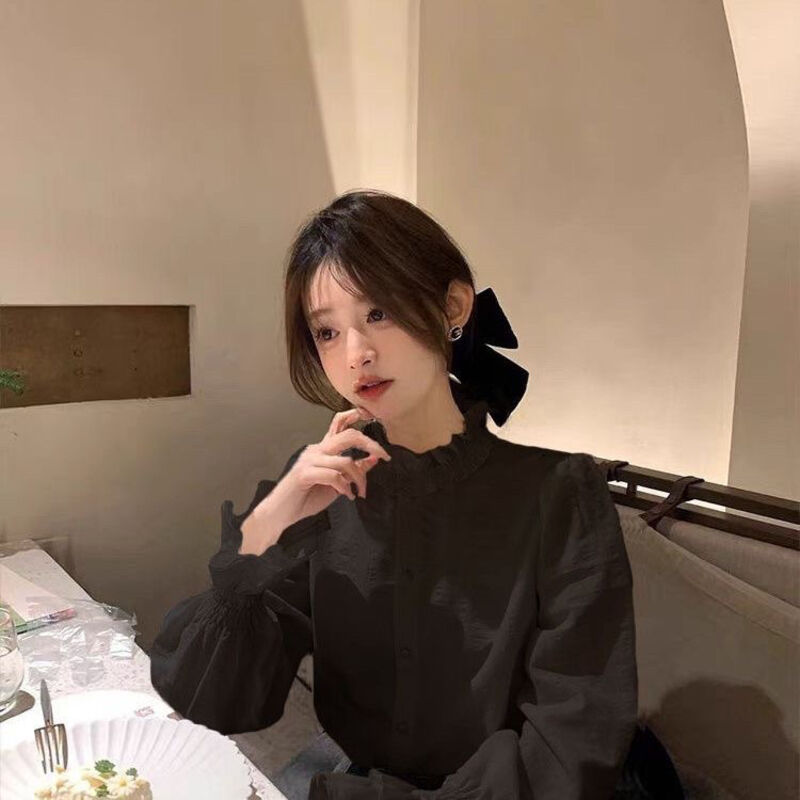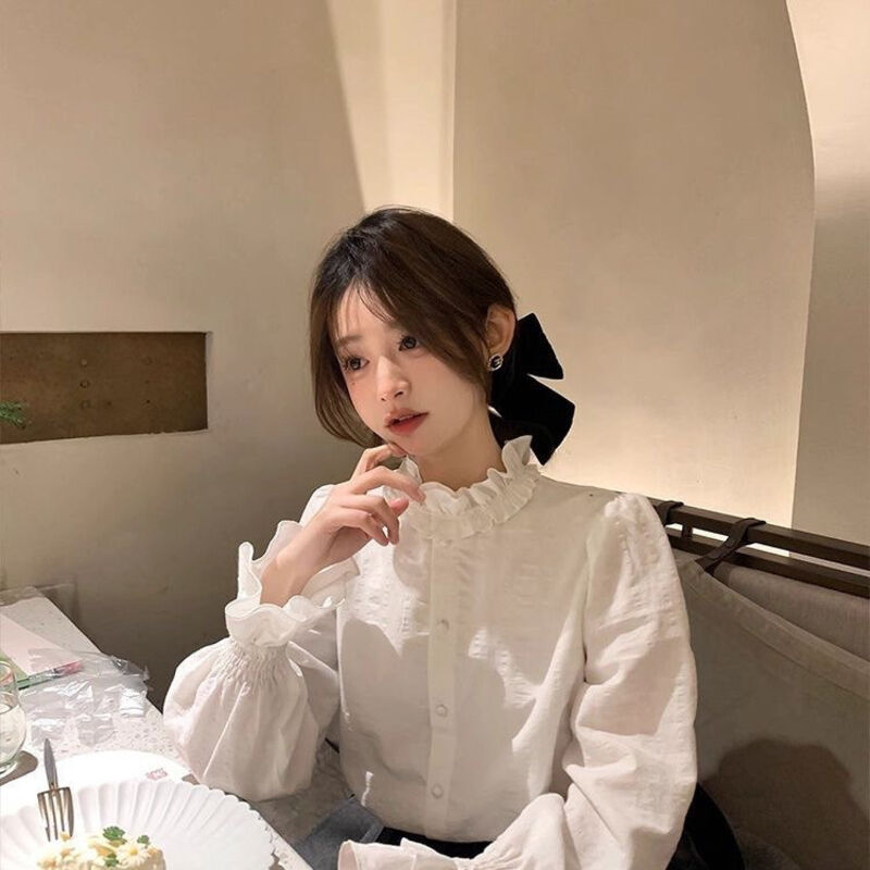 比比購 新上架 含發票 木耳花邊領白色襯衫 女新款早秋法式復古上衣疊穿內搭 打底 襯衣
