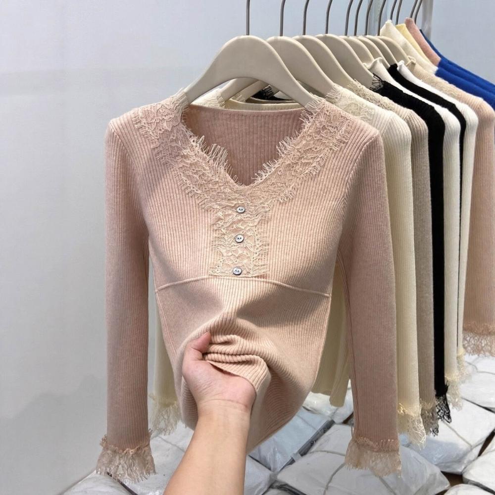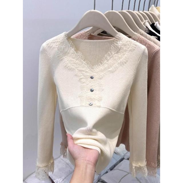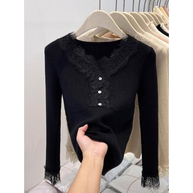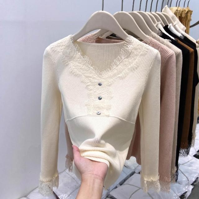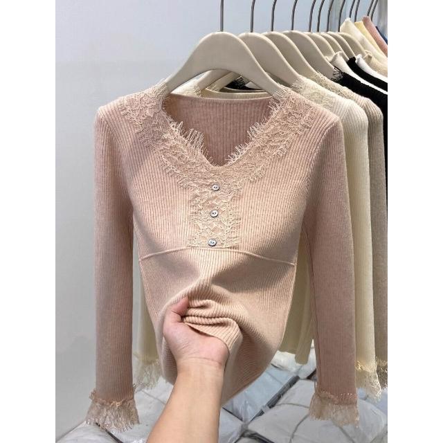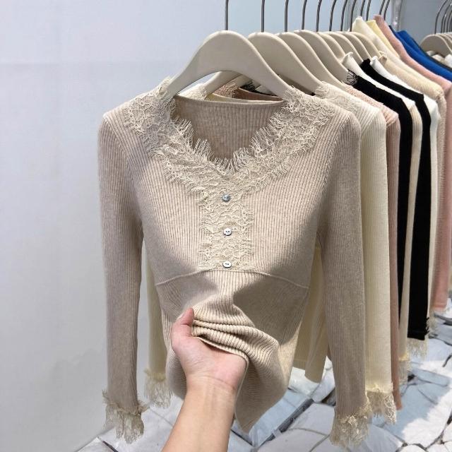 比比購 新上架 含發票 蕾絲拼接V領針織衫女2026秋冬新款爆款小衫修身內搭毛衣打底上衣