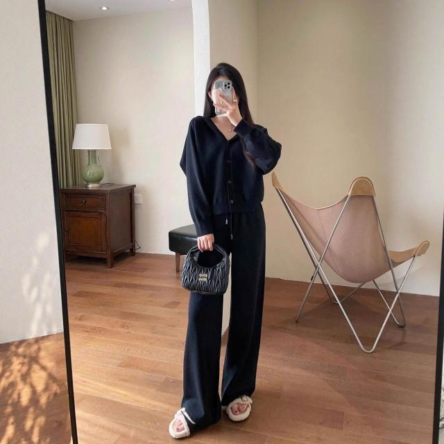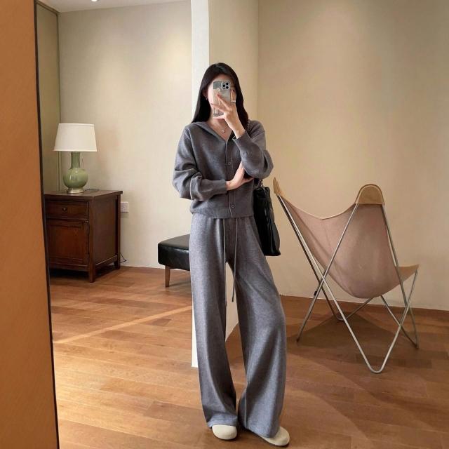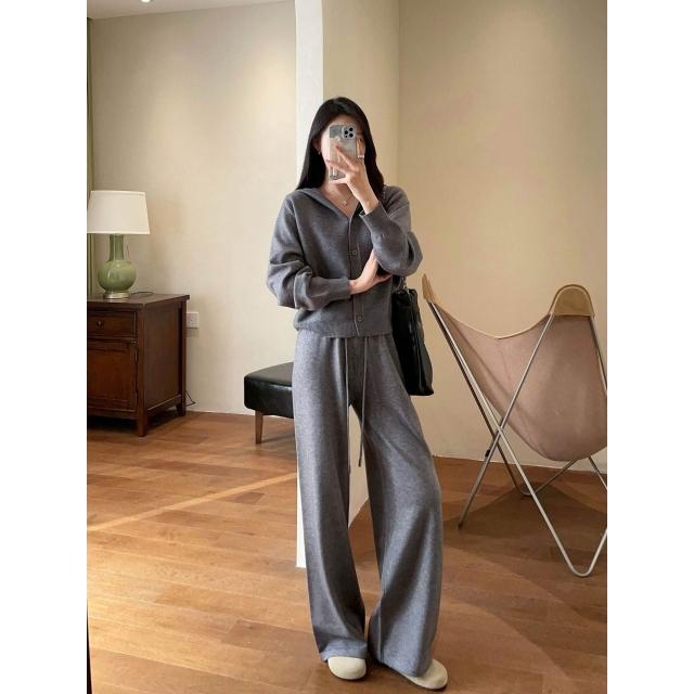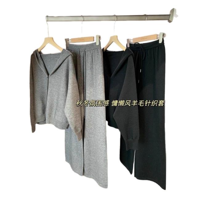 比比購 含發票 新上架 春不晚 立體剪裁 羊毛混紡柔軟輕盈寬松落肩針織連帽衫闊腿褲套裝