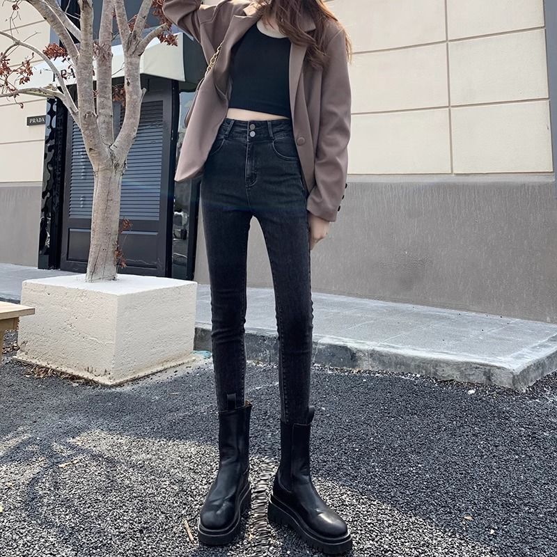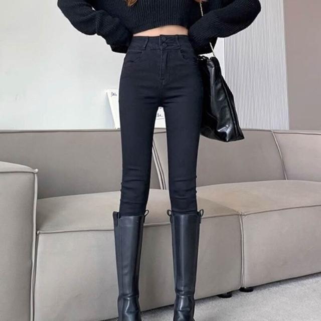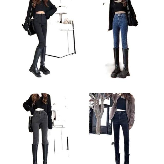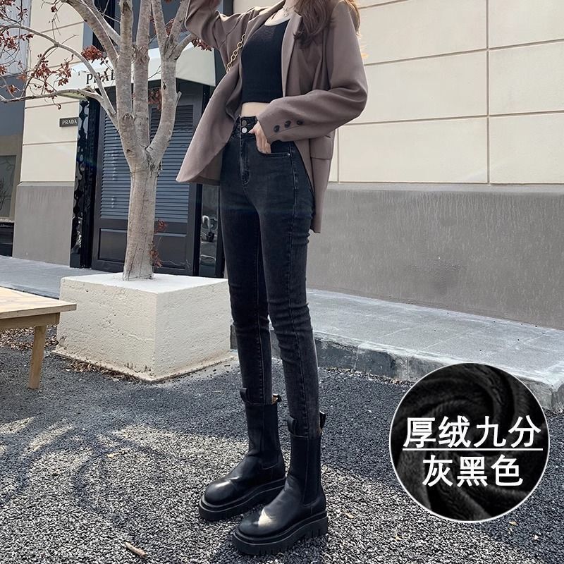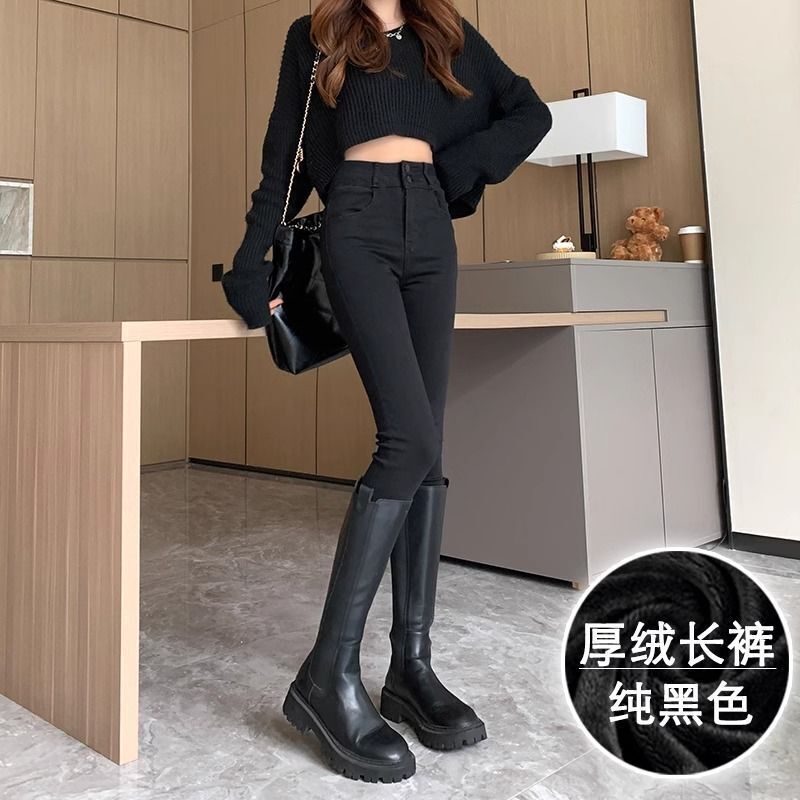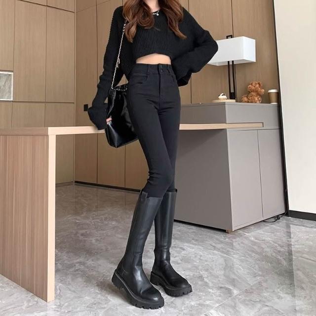 比比購 含發票 新上架 黑色高腰加絨小腳牛仔褲女2025年秋冬新款修身顯瘦緊身鉛筆靴子褲