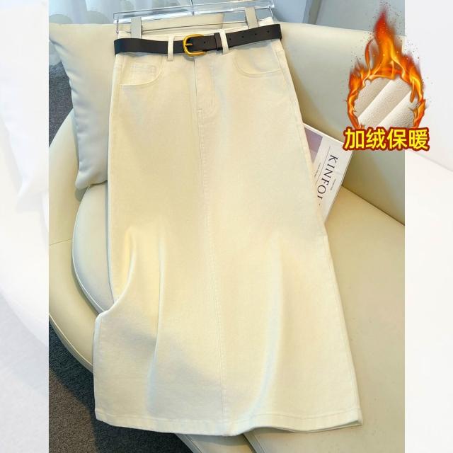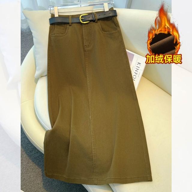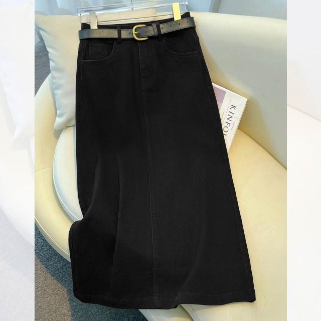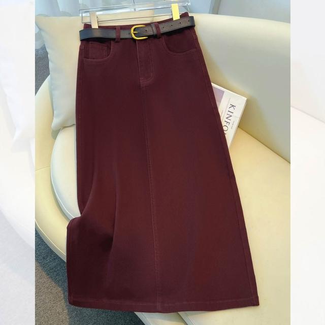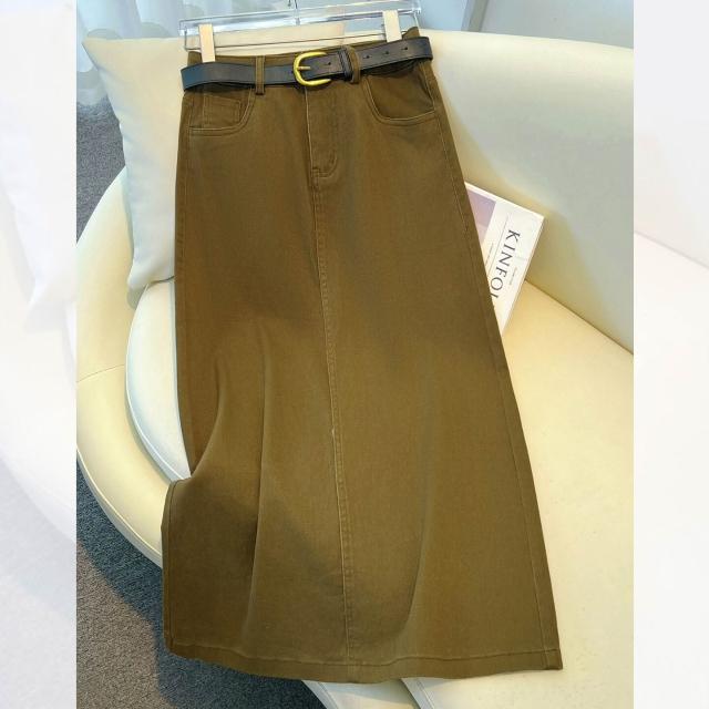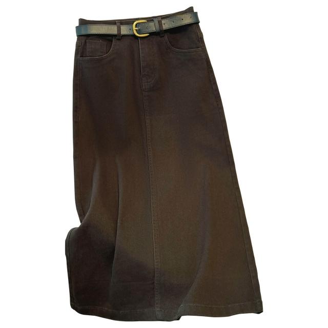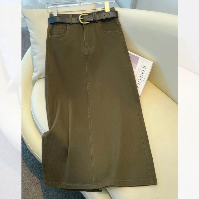 比比購 新上架 含發票 高腰牛仔半身裙女秋冬季2025新款咖色a字直筒裙復古開叉包臀裙子