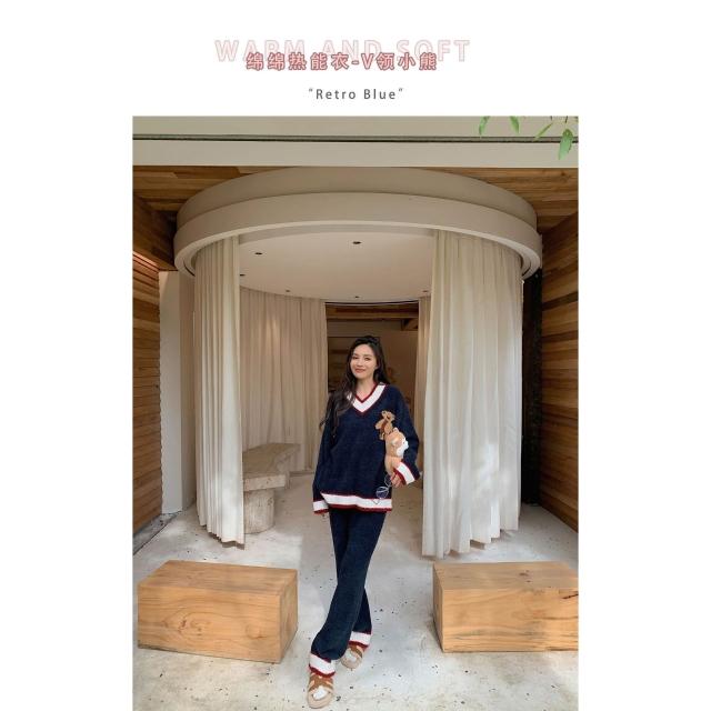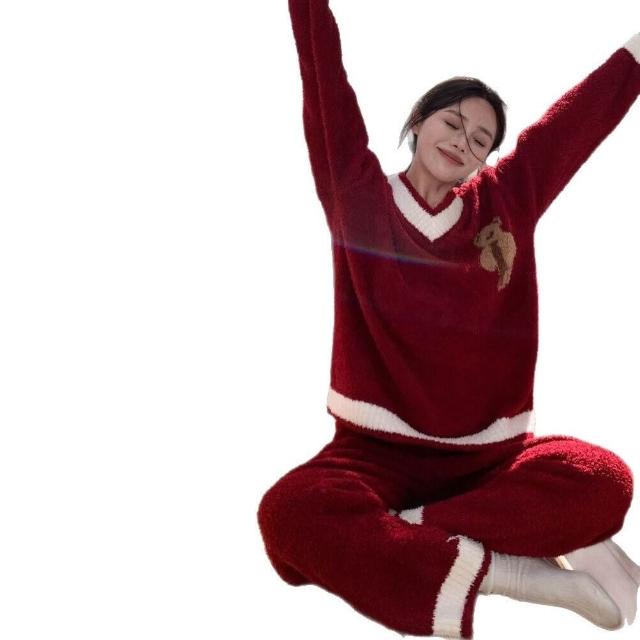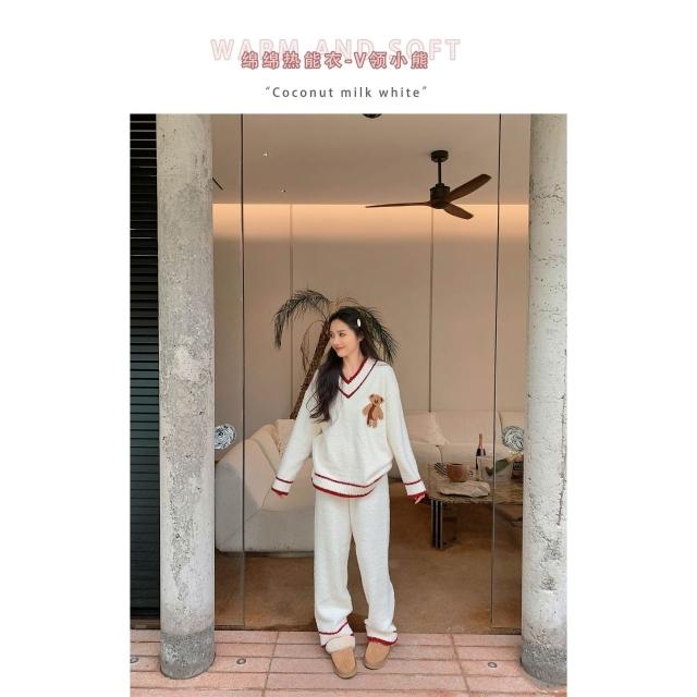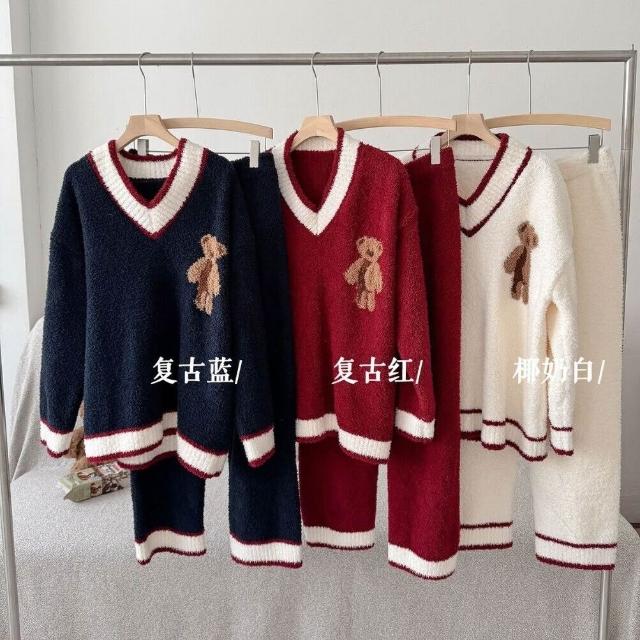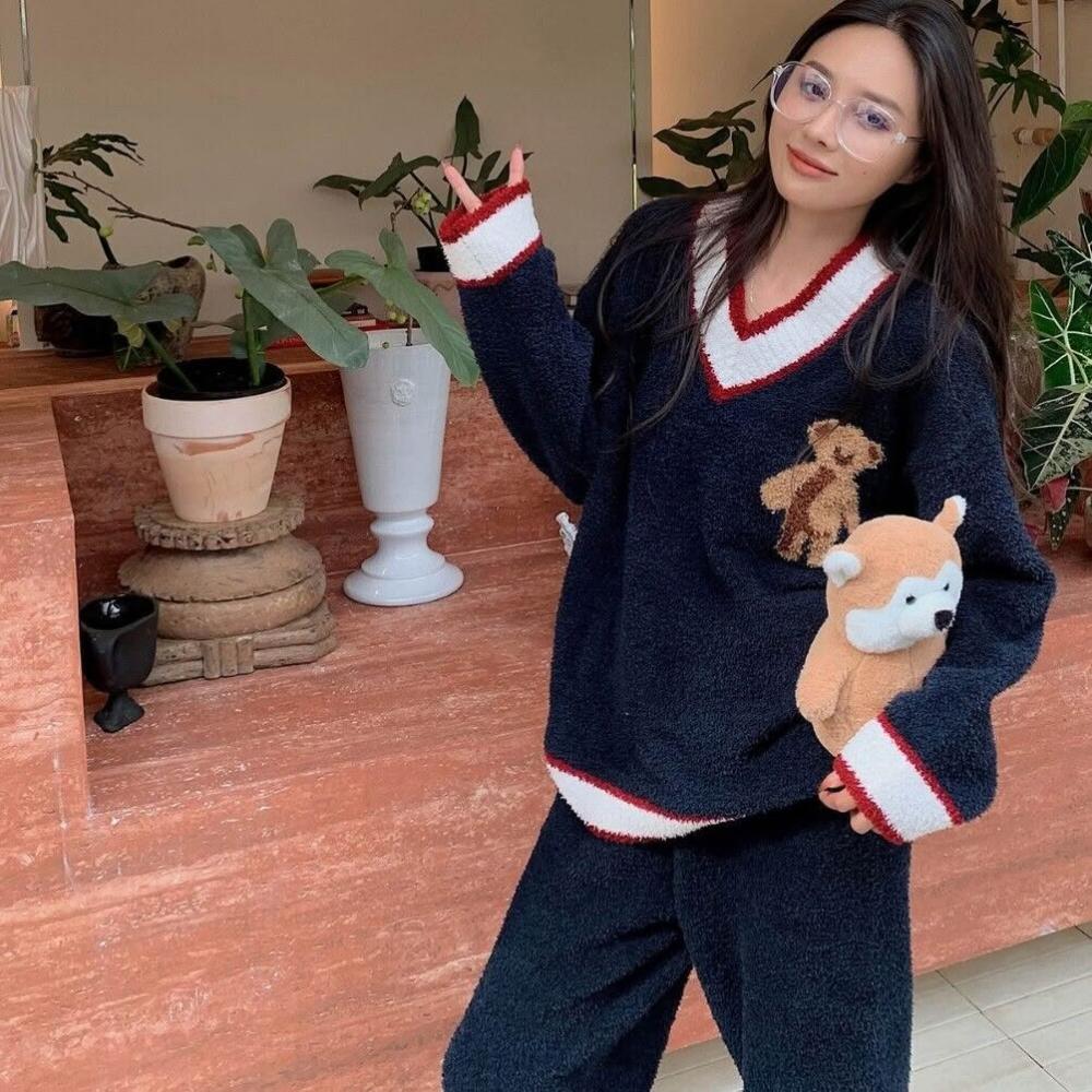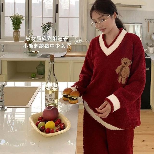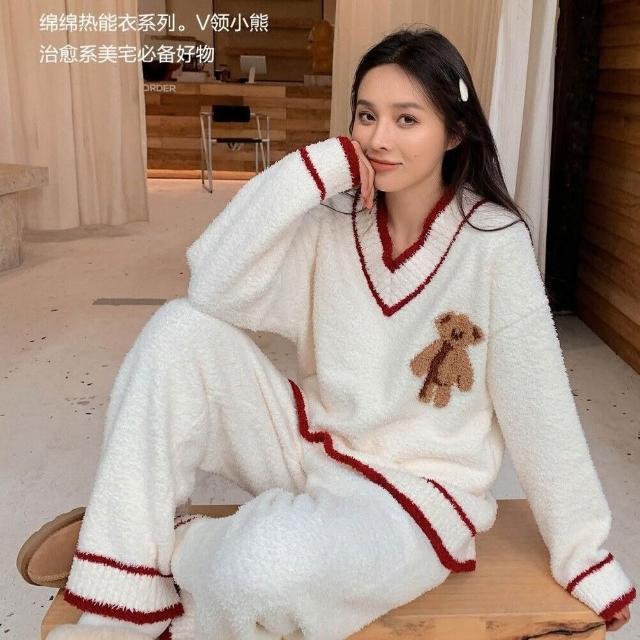 比比購 993秋冬軟綿綿半邊絨睡衣女可愛卡通V領聖誕小熊學院風家居服套裝