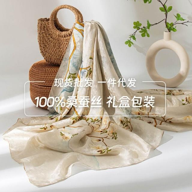 比比購 新上架 含發票 絲巾韓系氛圍感2025年春夏季新款印花輕薄桑蠶絲絲巾女百搭大披肩