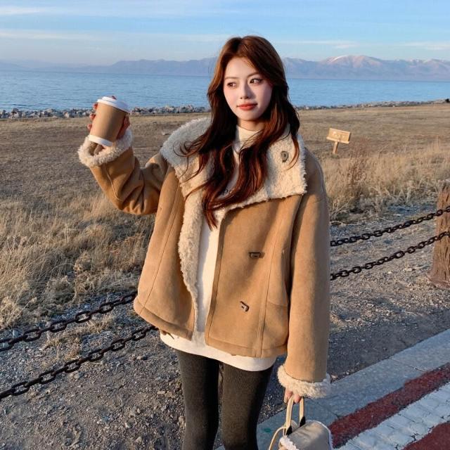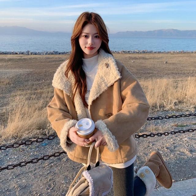 比比購 新上架 實拍卡其色兩面穿羊羔毛短外套女2025冬季新款皮毛一體加厚小個子