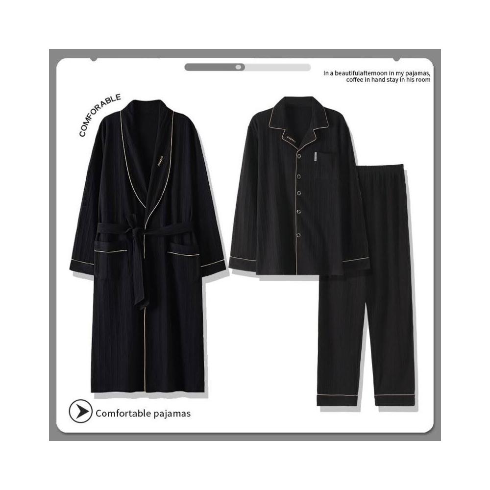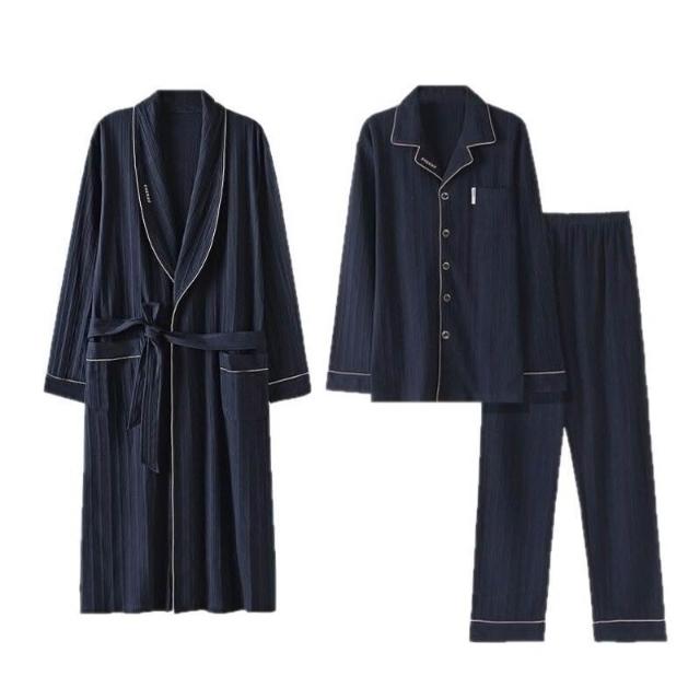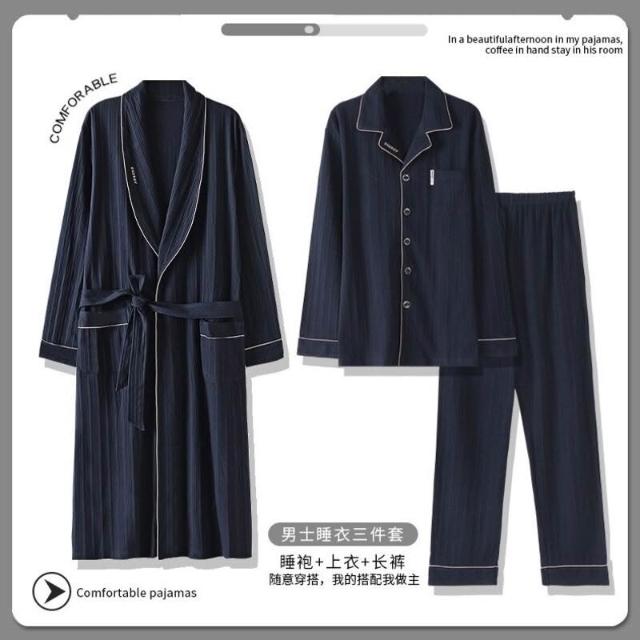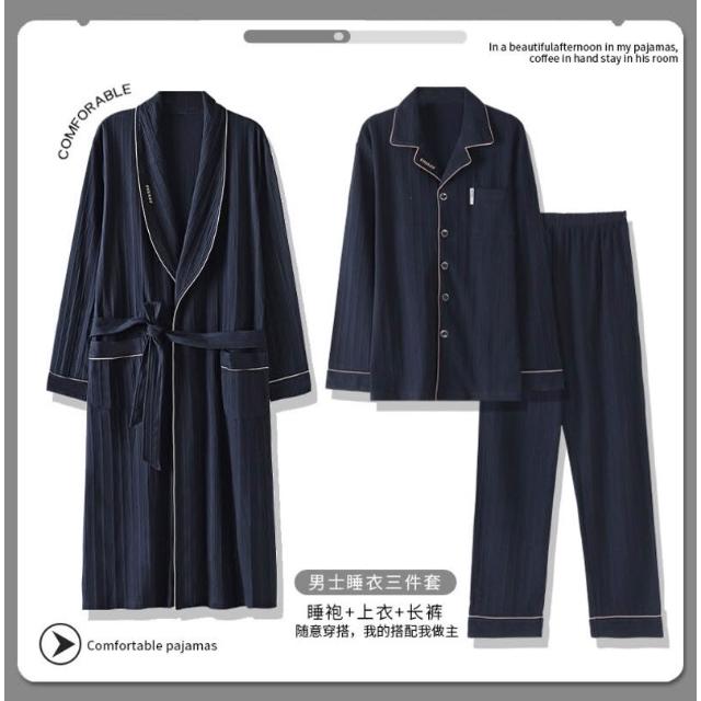比比購 睡衣男士睡袍春秋款棉質長袖家居服男款浴袍中長款三件套裝居家服