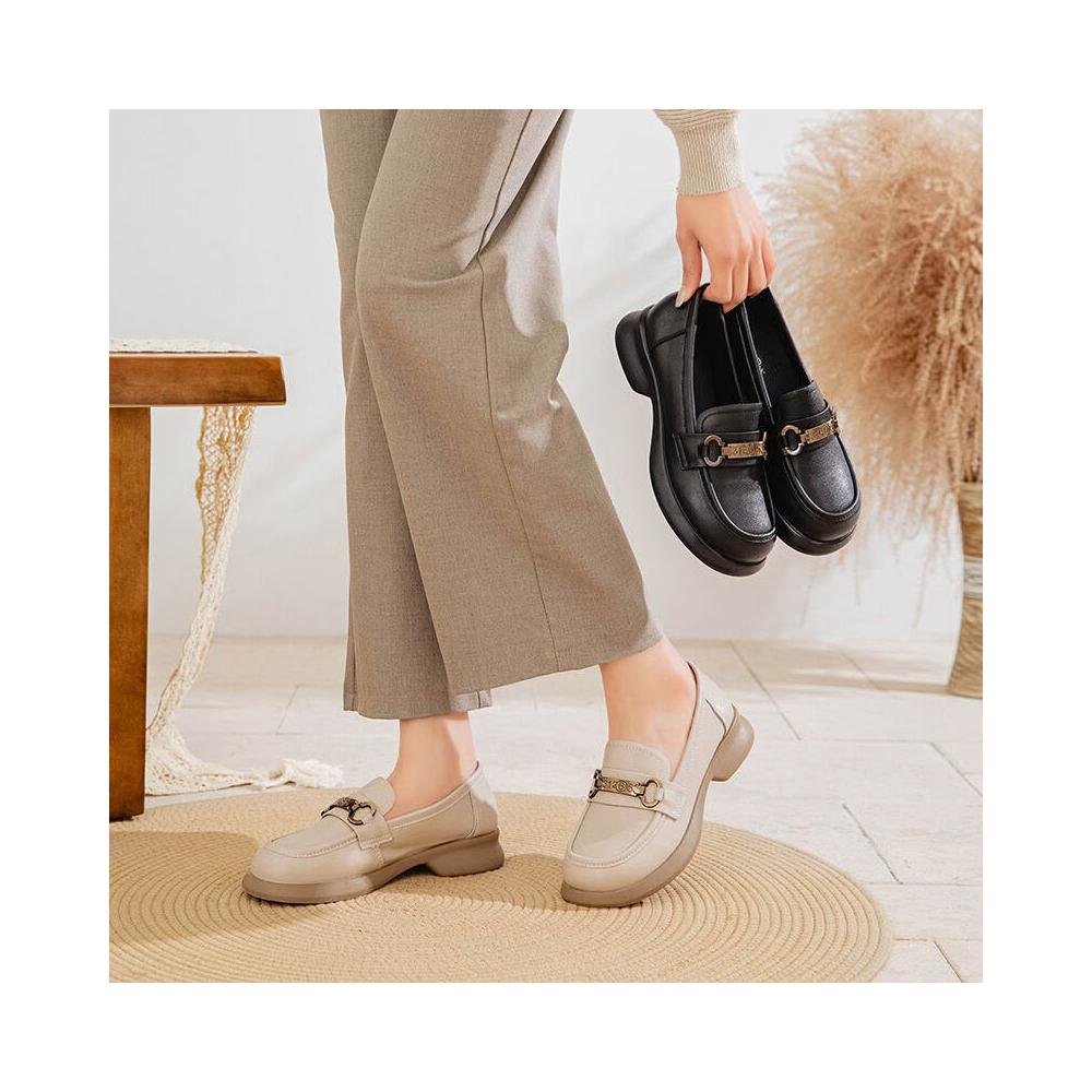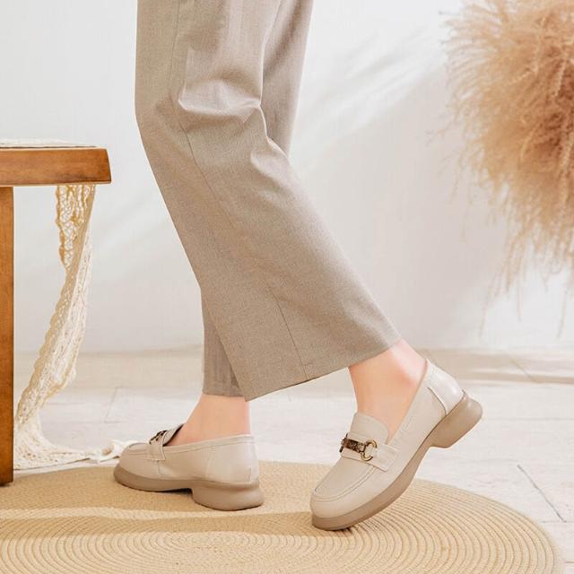 比比購 真皮女鞋2025春季新款一腳蹬軟底樂福鞋牛皮圓頭扣件休閑小皮鞋