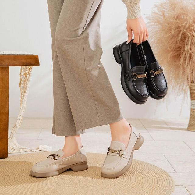比比購 真皮女鞋2025春季新款一腳蹬軟底樂福鞋牛皮圓頭扣件休閑小皮鞋