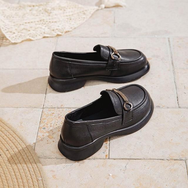 比比購 真皮女鞋2025春季新款一腳蹬軟底樂福鞋牛皮圓頭扣件休閑小皮鞋