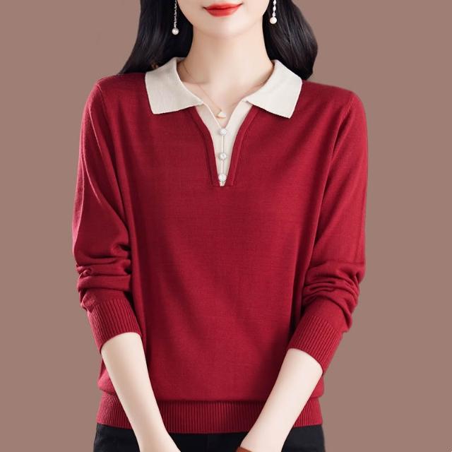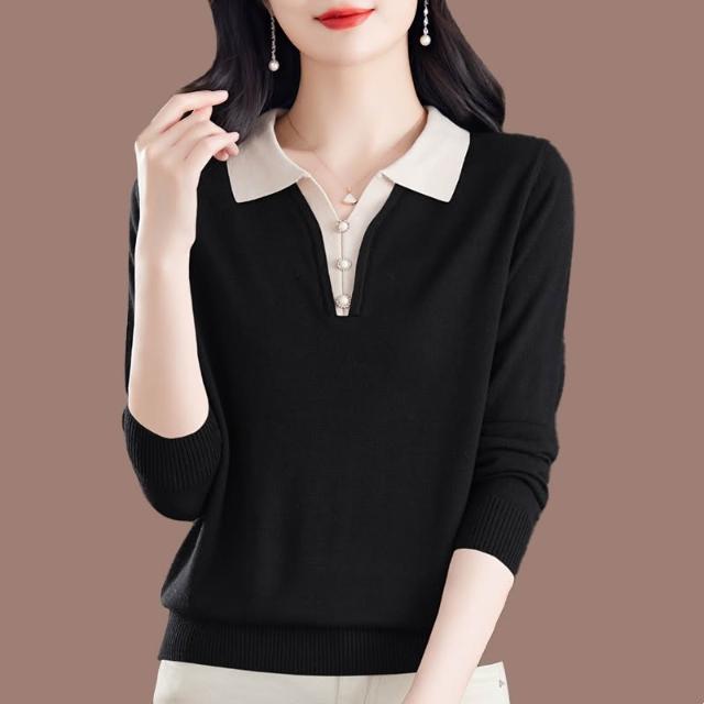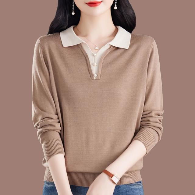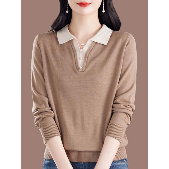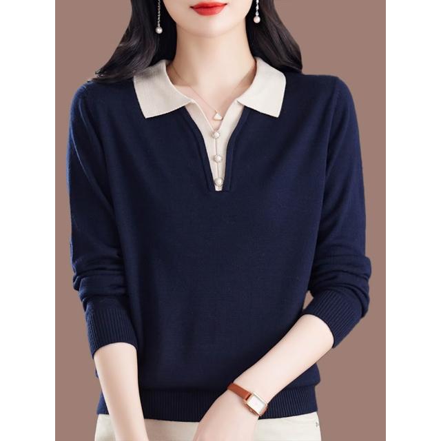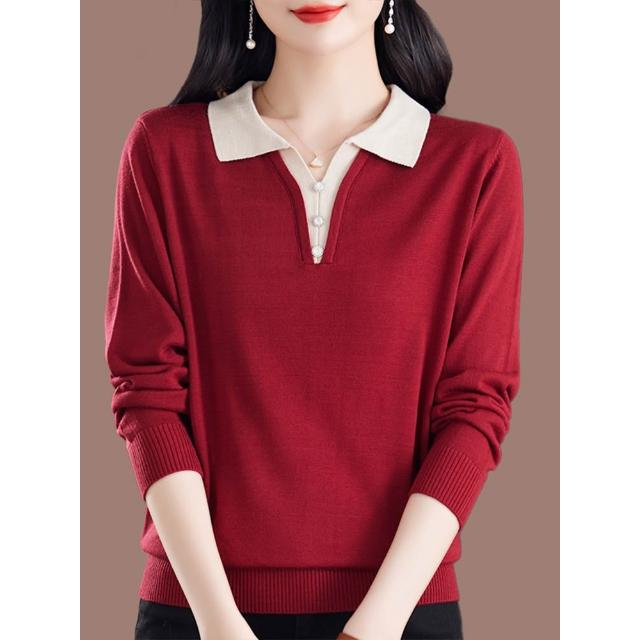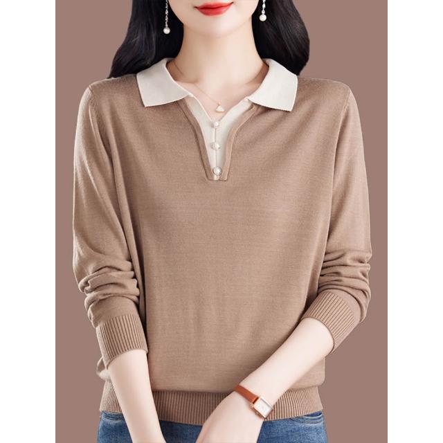 新款春季長袖 新款桑蠶絲長袖t恤女媽媽寬松翻領上衣氣質春秋薄款針織打底小衫 比比購