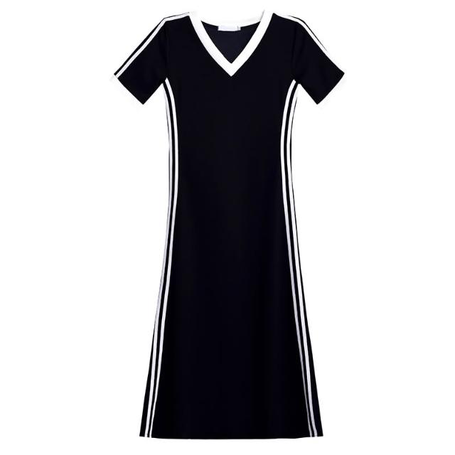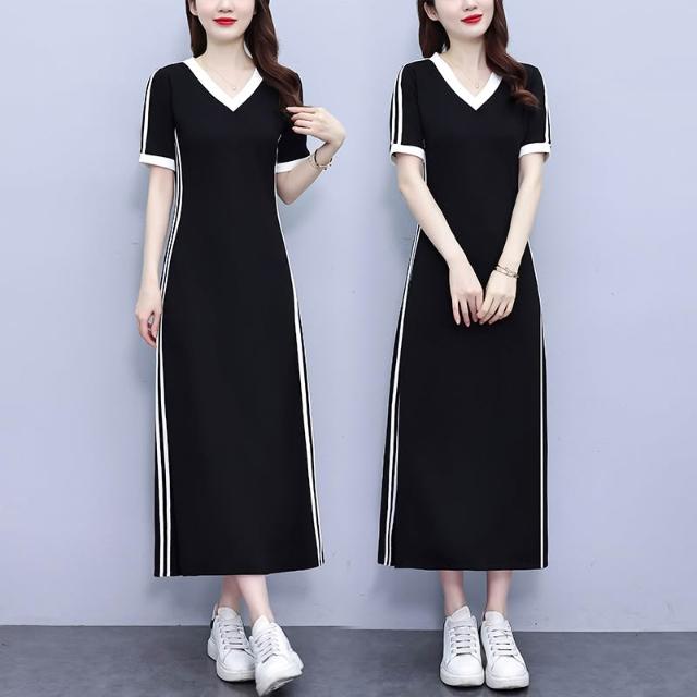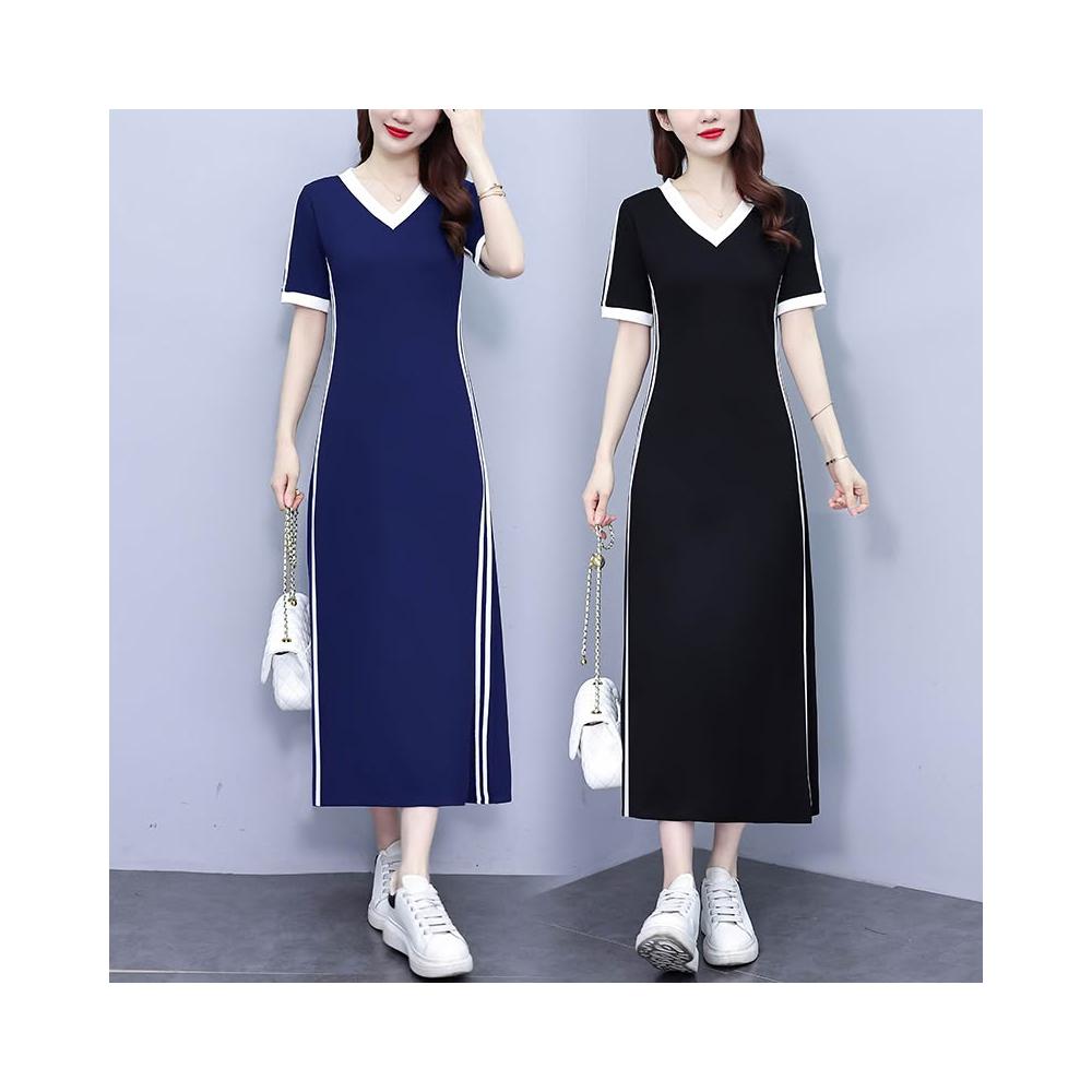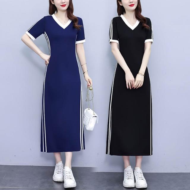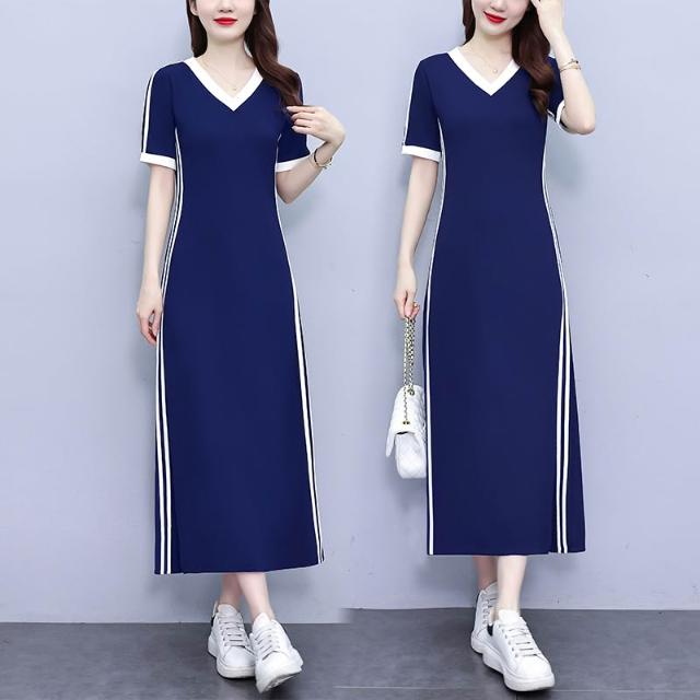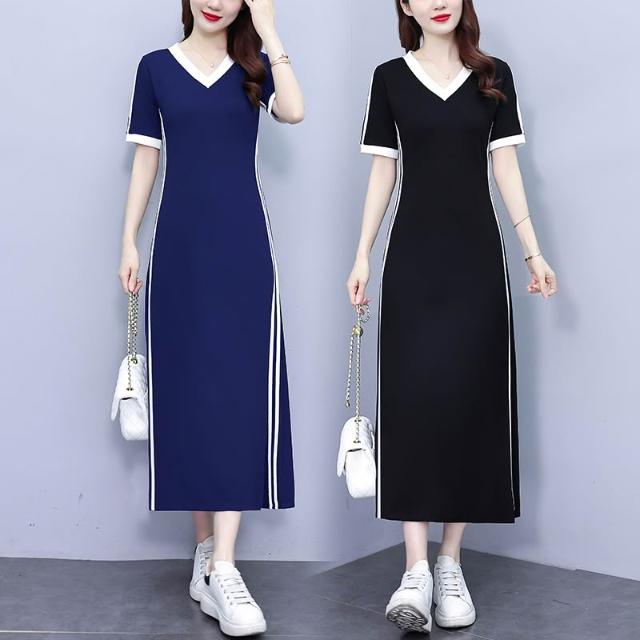 新款夏季連衣裙 2023夏季新款V領顯瘦過膝長裙胖MM收腰顯瘦短袖休閑連衣裙 比比購