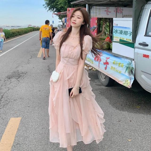 新款夏季連衣裙 法式方領甜美溫柔仙女風連衣裙女夏季新款女裝收腰顯瘦中長款裙子 比比購