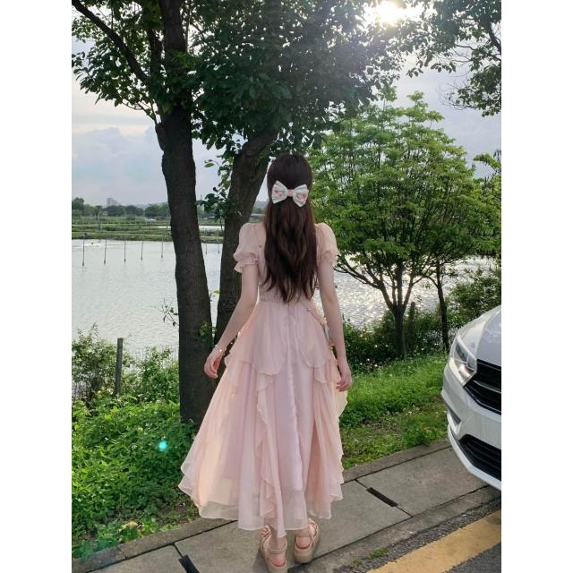 新款夏季連衣裙 法式方領甜美溫柔仙女風連衣裙女夏季新款女裝收腰顯瘦中長款裙子 比比購