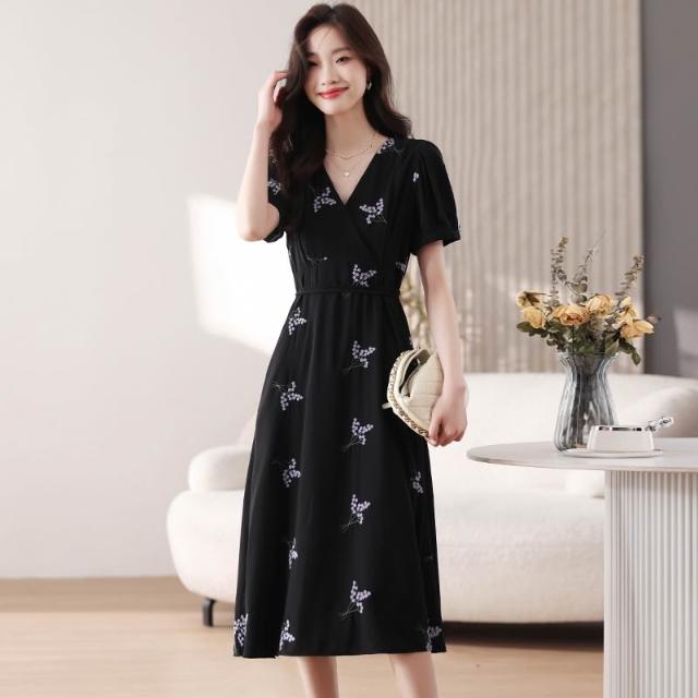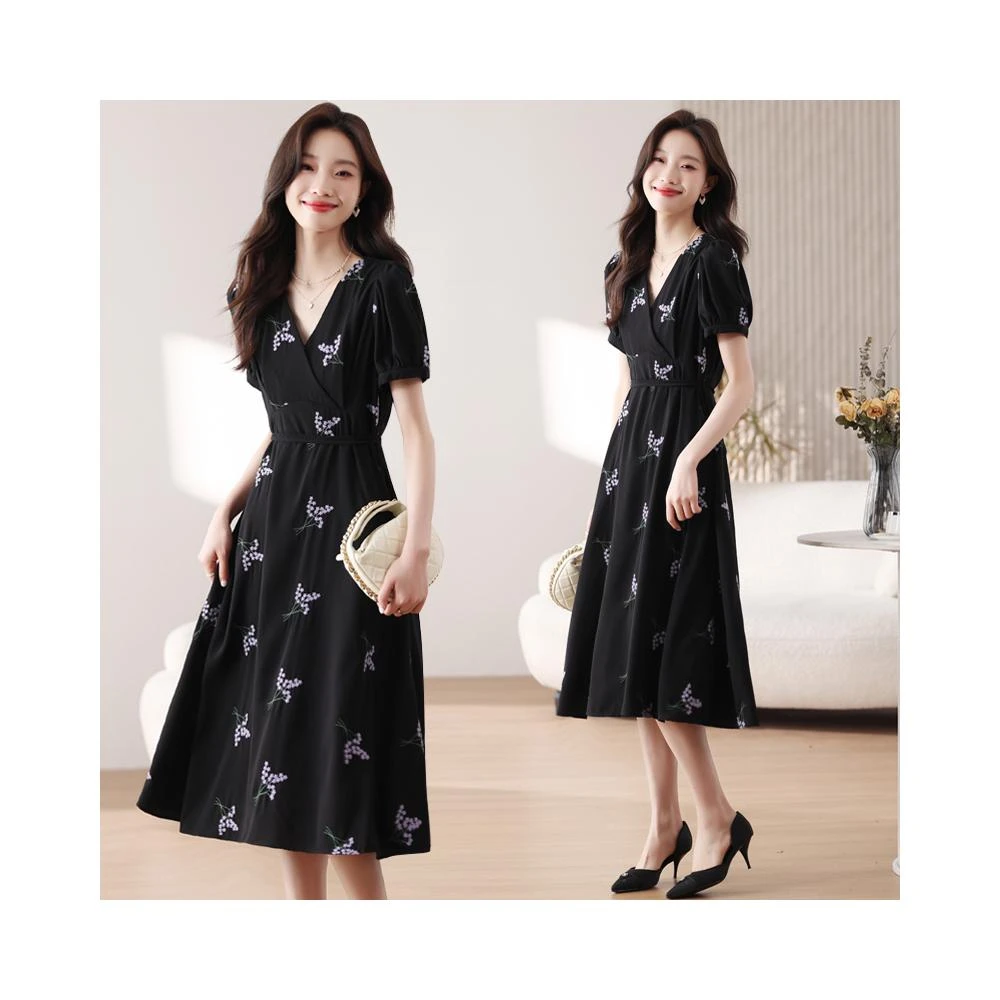 新款夏季連衣裙 實拍薔薇園2026夏季法式黑色V領收腰a字裙花朵顯瘦連衣裙女 比比購
