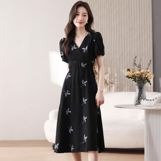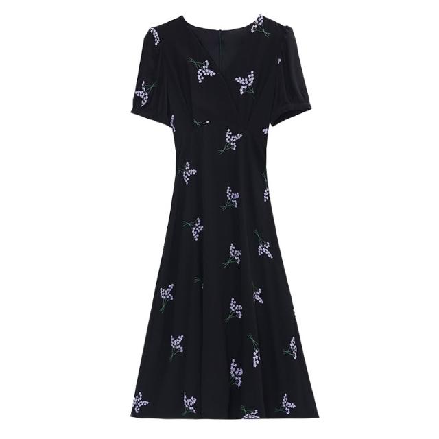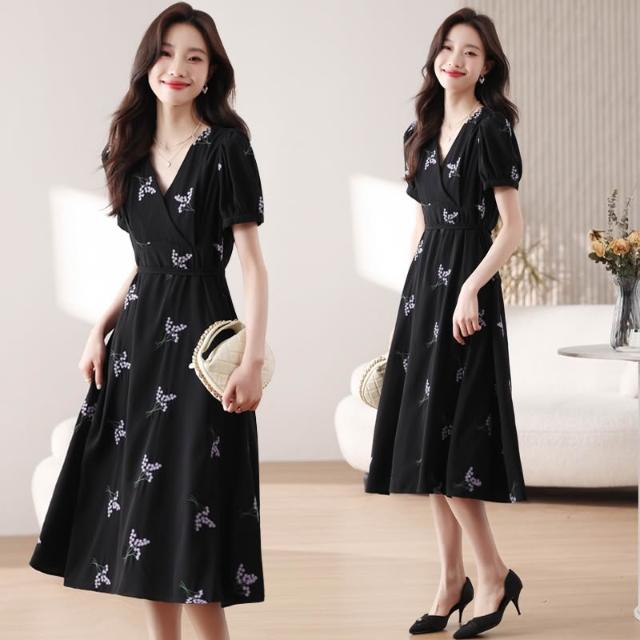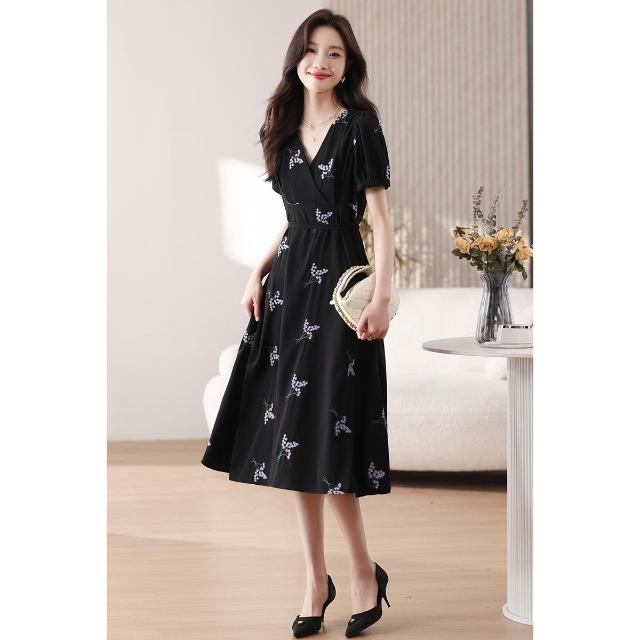 新款夏季連衣裙 實拍薔薇園2026夏季法式黑色V領收腰a字裙花朵顯瘦連衣裙女 比比購