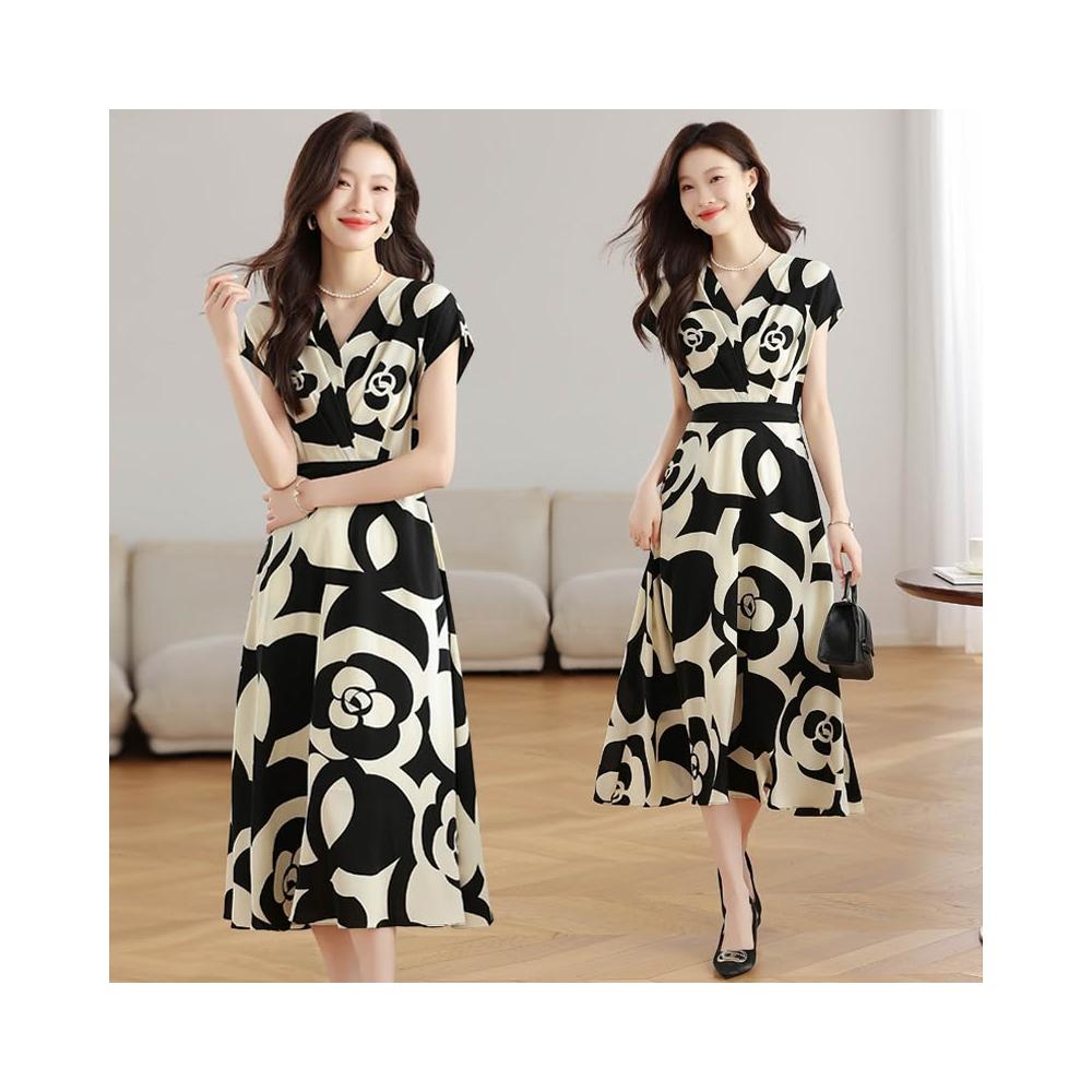 新款夏季連衣裙 實拍夏季新款女法式v領收腰氣質a字裙溫柔風印花中長款雪紡連衣裙 比比購