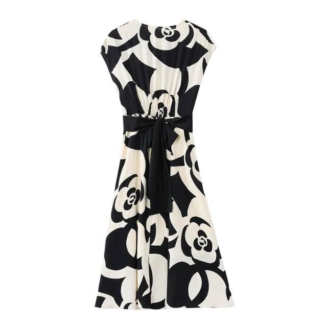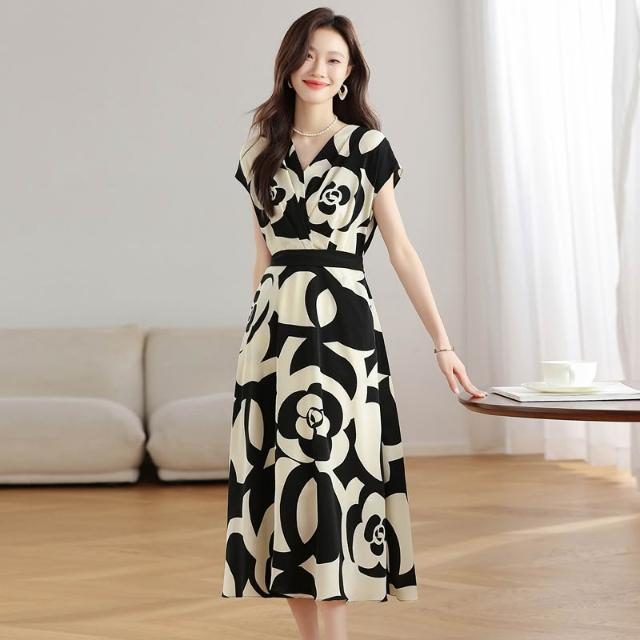 新款夏季連衣裙 實拍夏季新款女法式v領收腰氣質a字裙溫柔風印花中長款雪紡連衣裙 比比購