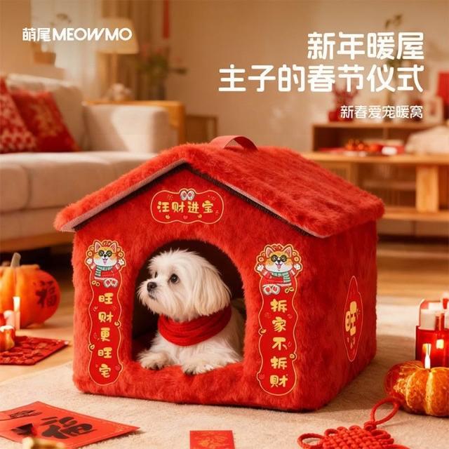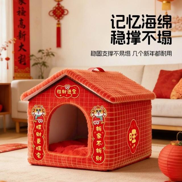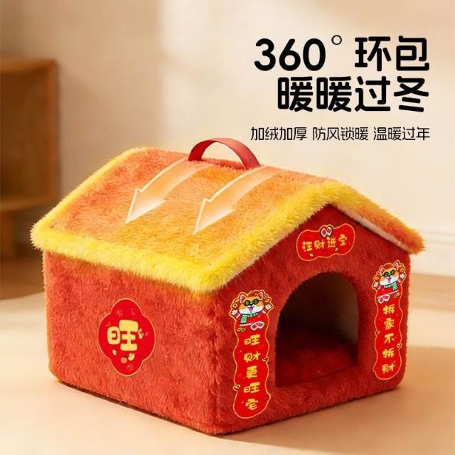 精選聯盟萌尾新年春節貓窩紅色過年加厚保暖寵物防風貓屋狗窩房子封閉式