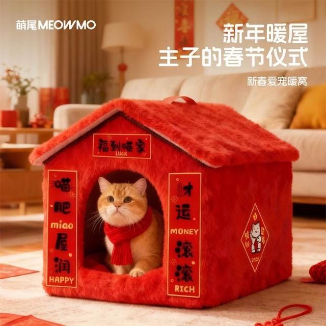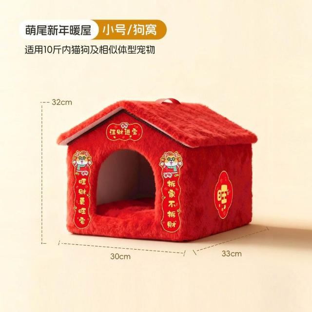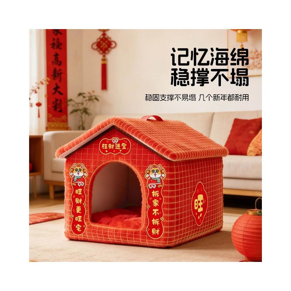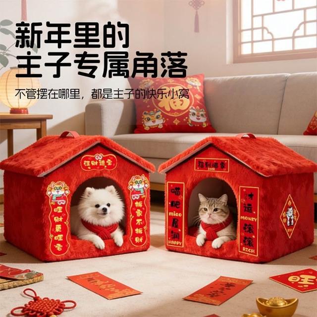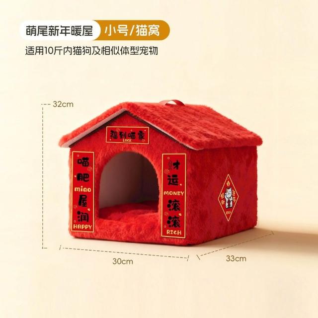 精選聯盟萌尾新年春節貓窩紅色過年加厚保暖寵物防風貓屋狗窩房子封閉式