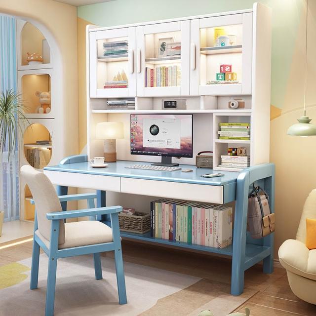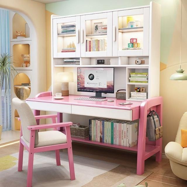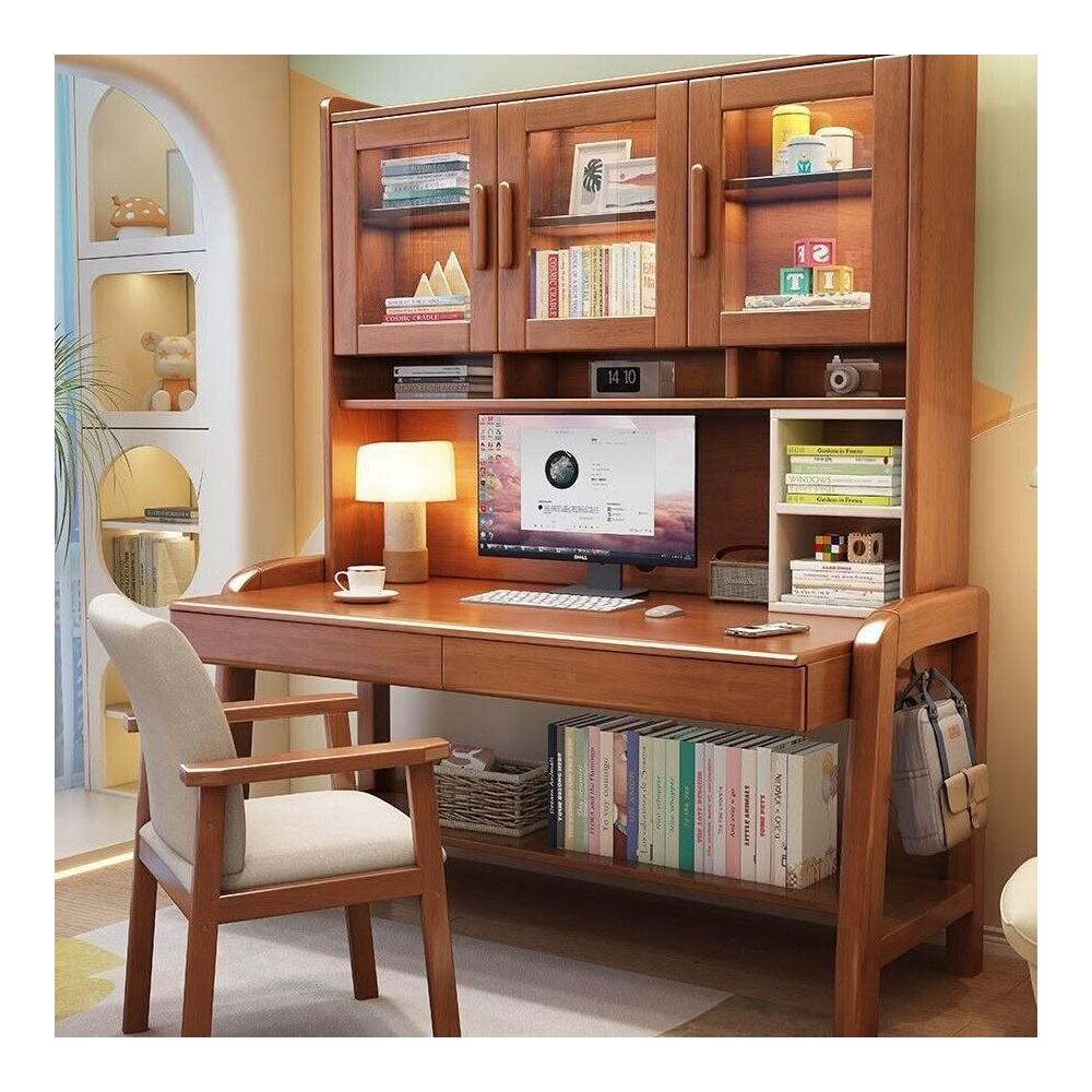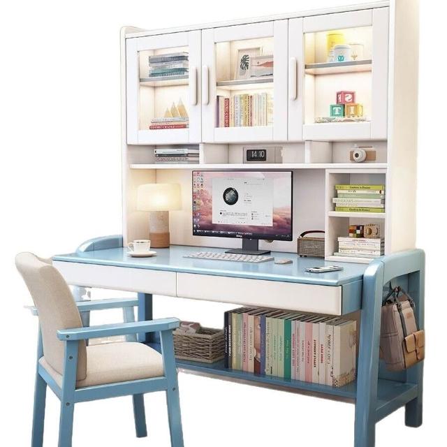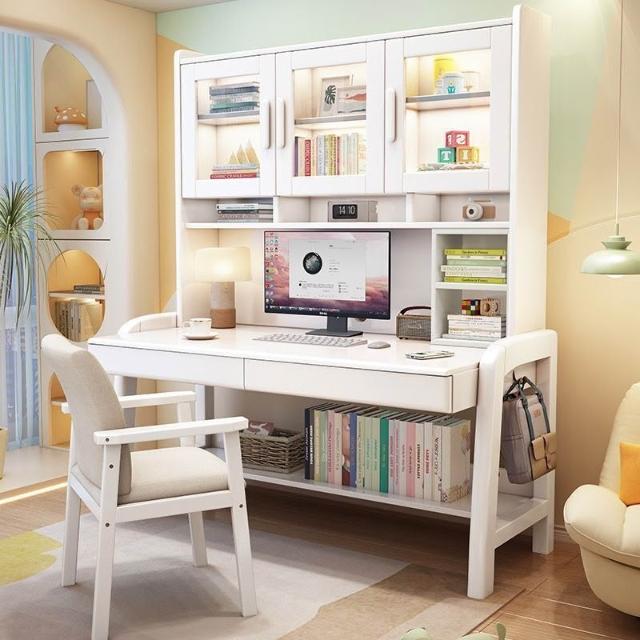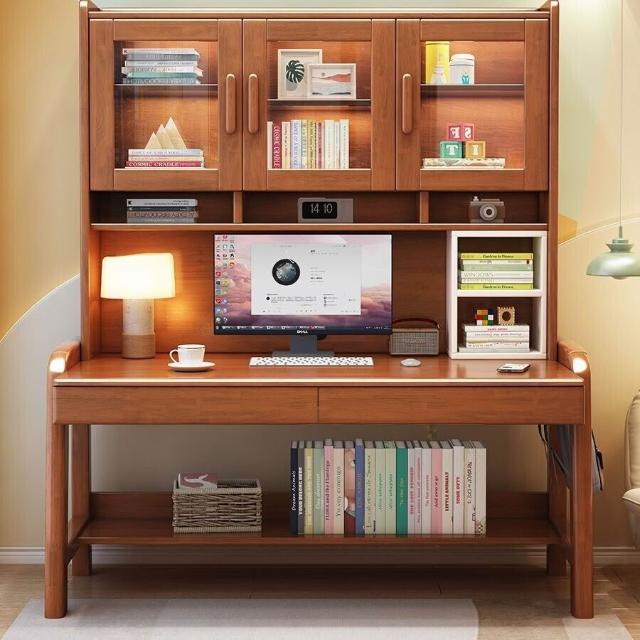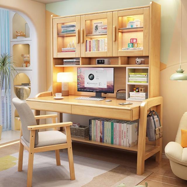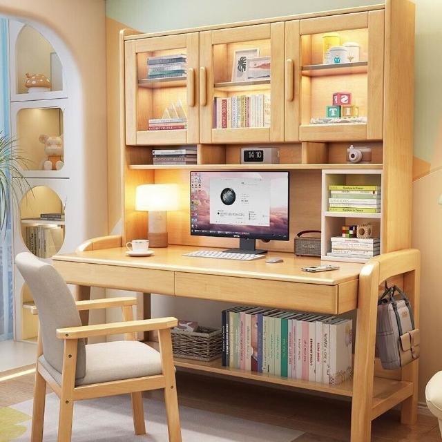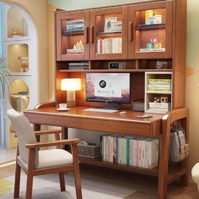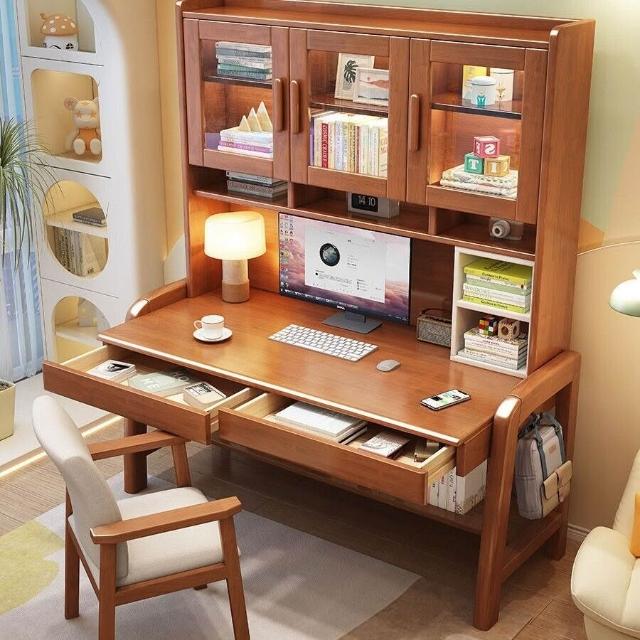 免運 簡約現代書房實木書桌家用臥室辦公電腦桌學生書架書櫃一體寫字桌