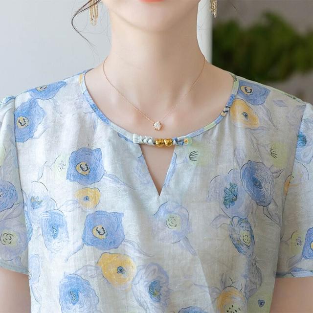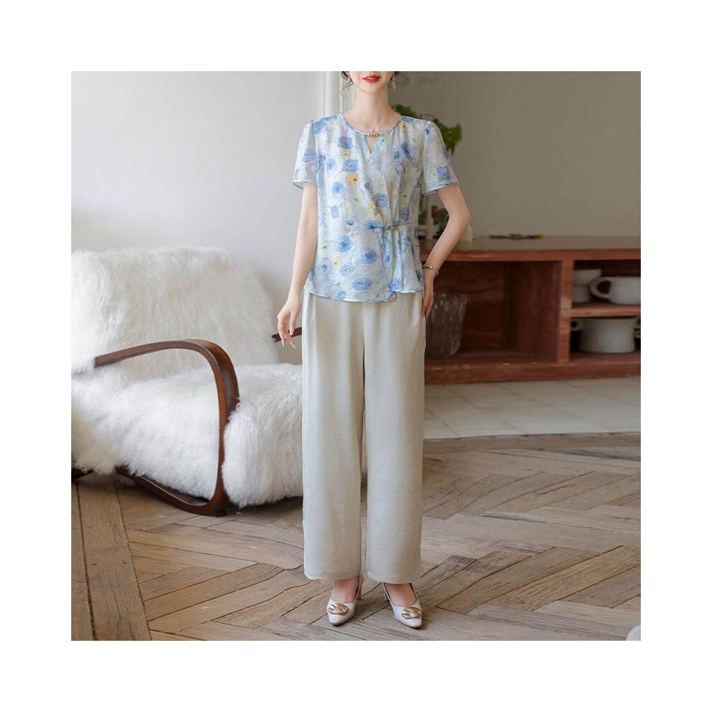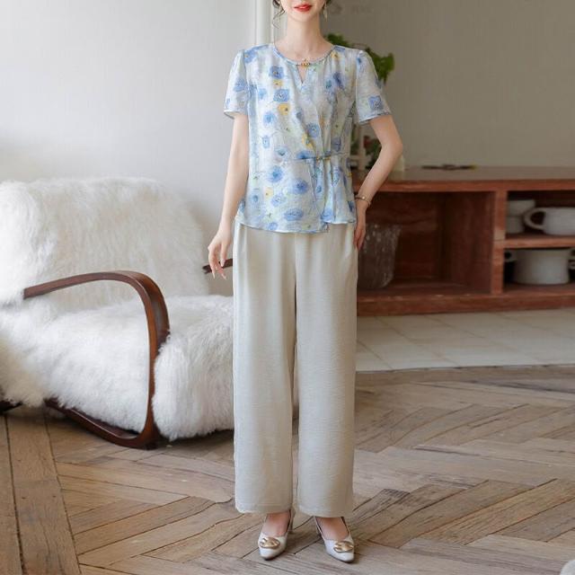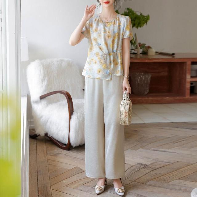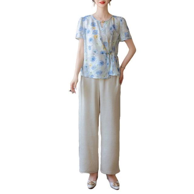 品質媽媽套裝女裝夏洋氣印花雪紡衫窄版闊腿褲兩件套中年女裝夏裝