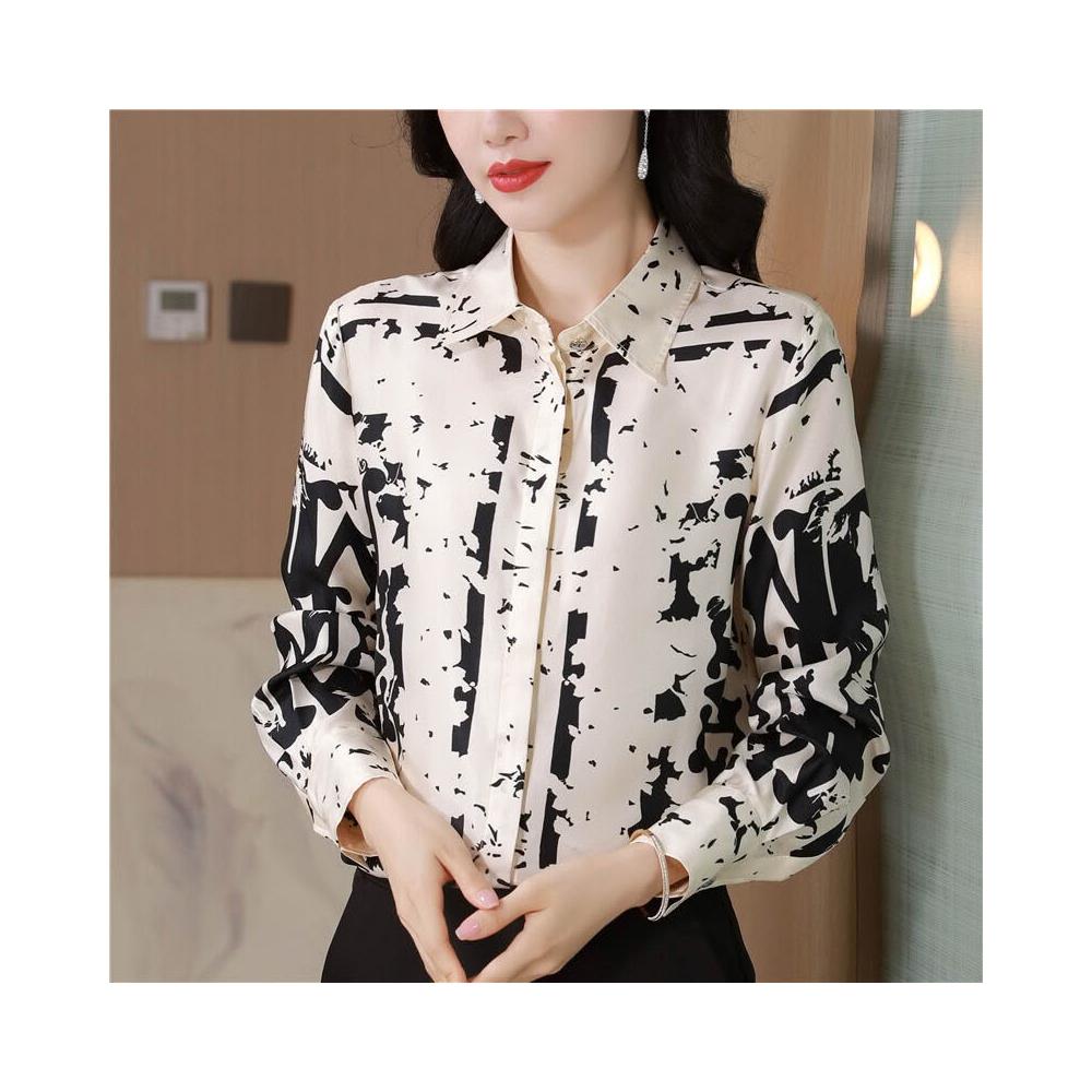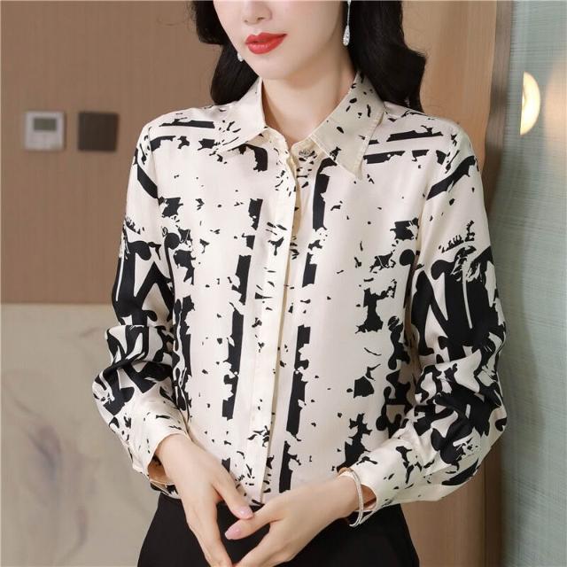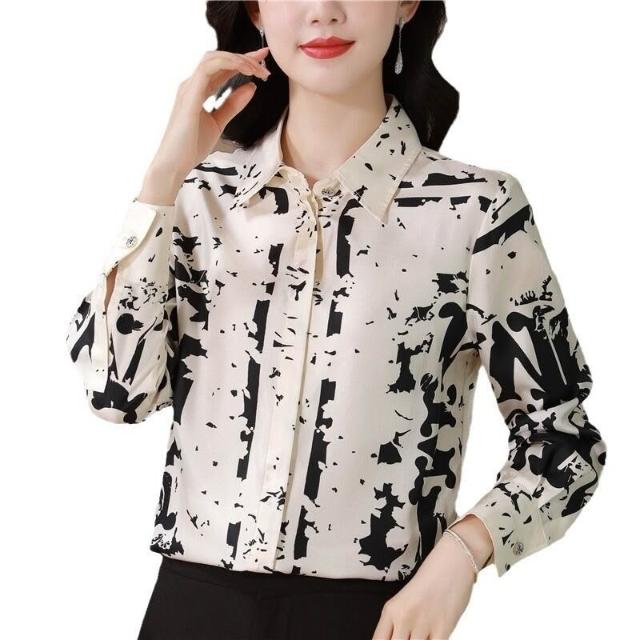 2025春裝桑蠶絲長袖襯衫洋氣印花上衣中年女士時尚翻領真絲襯衣女