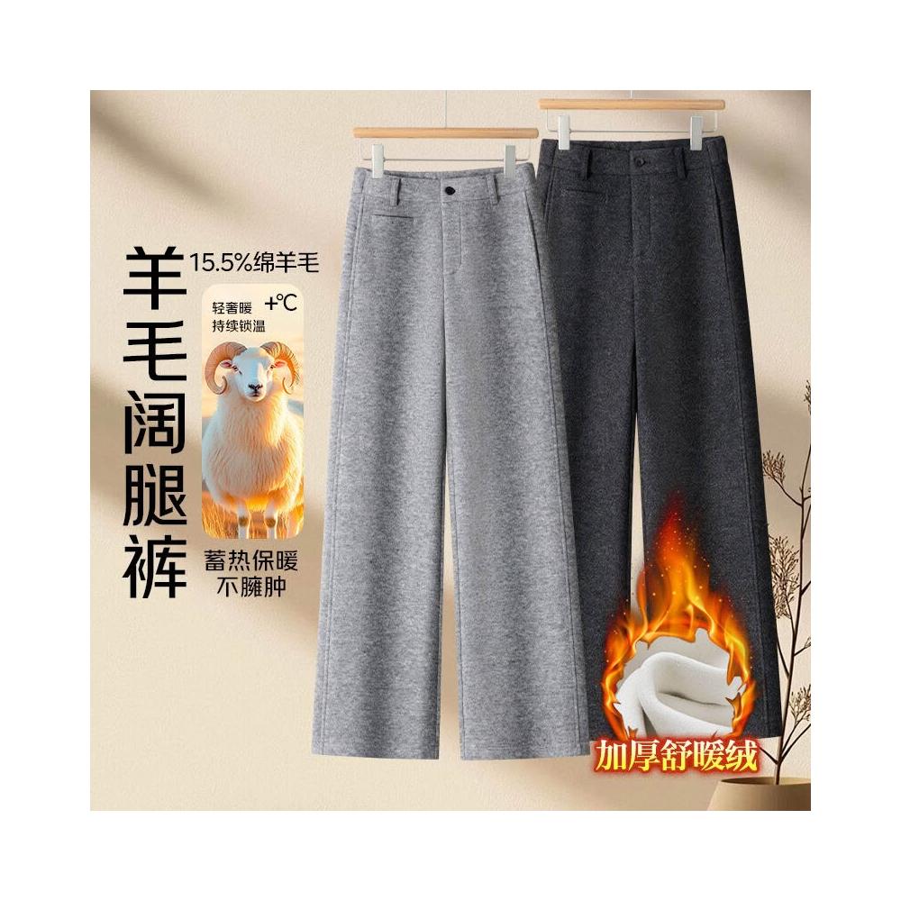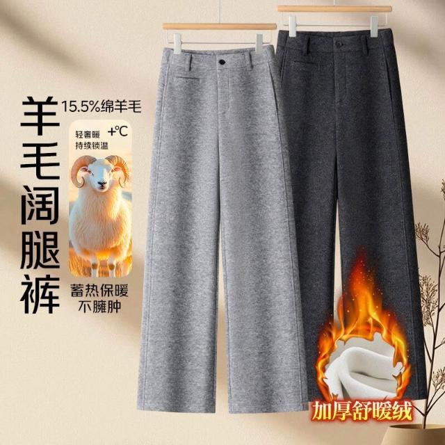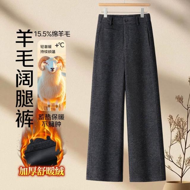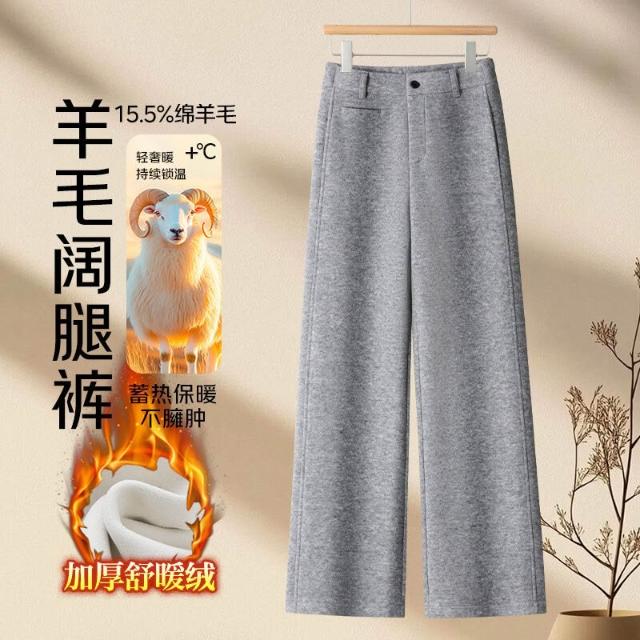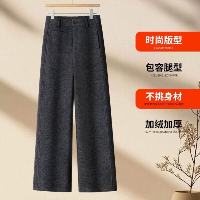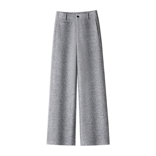 加絨加厚羊毛呢窄版闊腿褲女高腰休閑顯瘦灰色長褲2025年冬季新款