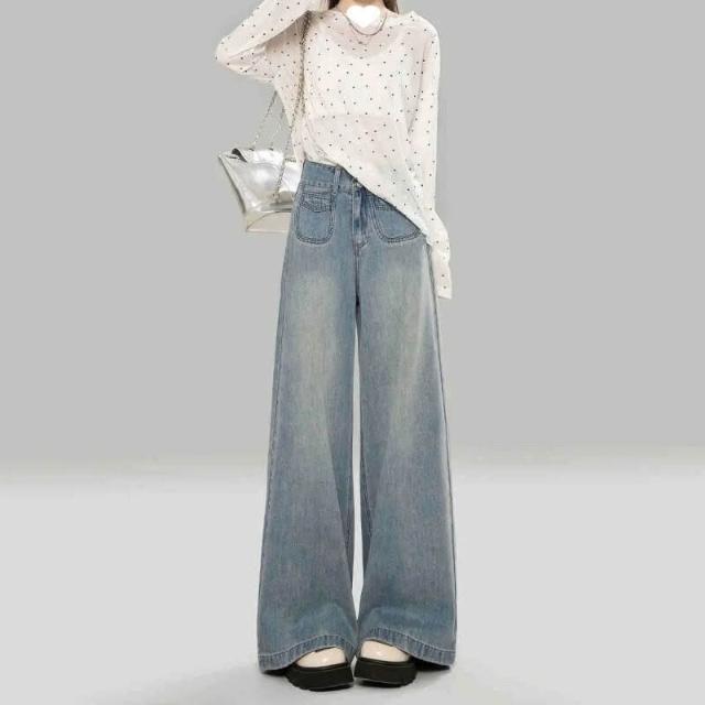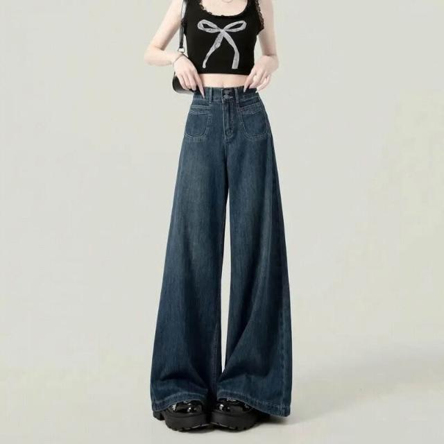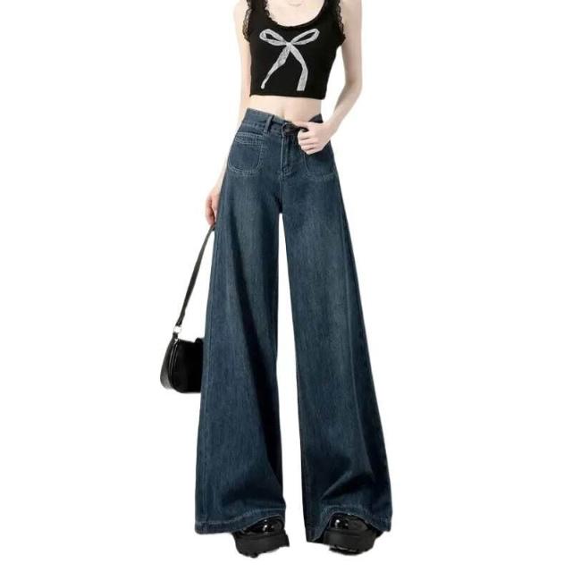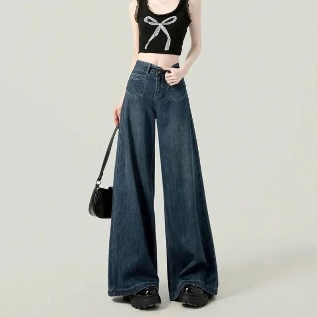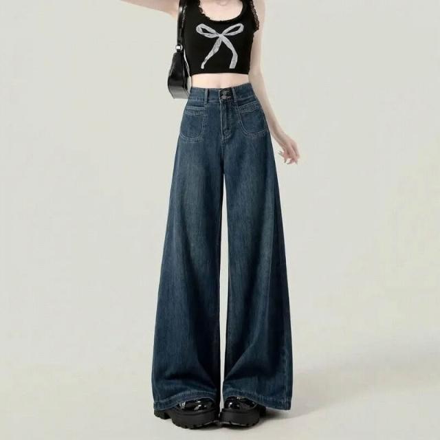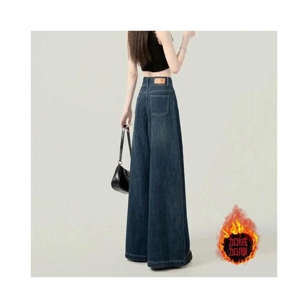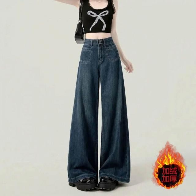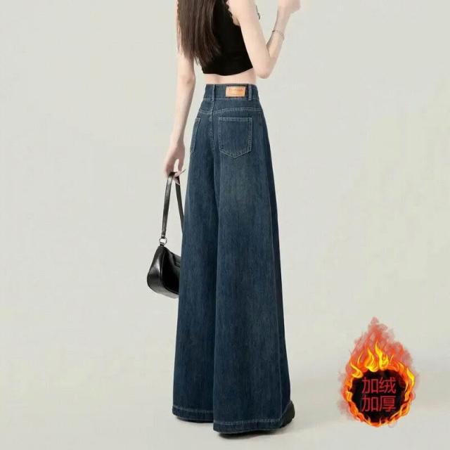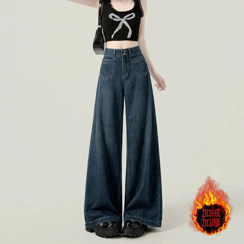 復古加絨加厚闊腿牛仔褲女冬季新款設計感高腰寬松顯瘦百搭拖地褲