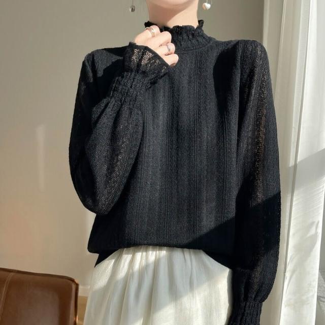 精紡蕾絲羊毛薄款打底衫女春秋新款半高領毛衣镂空根紗針織上衣