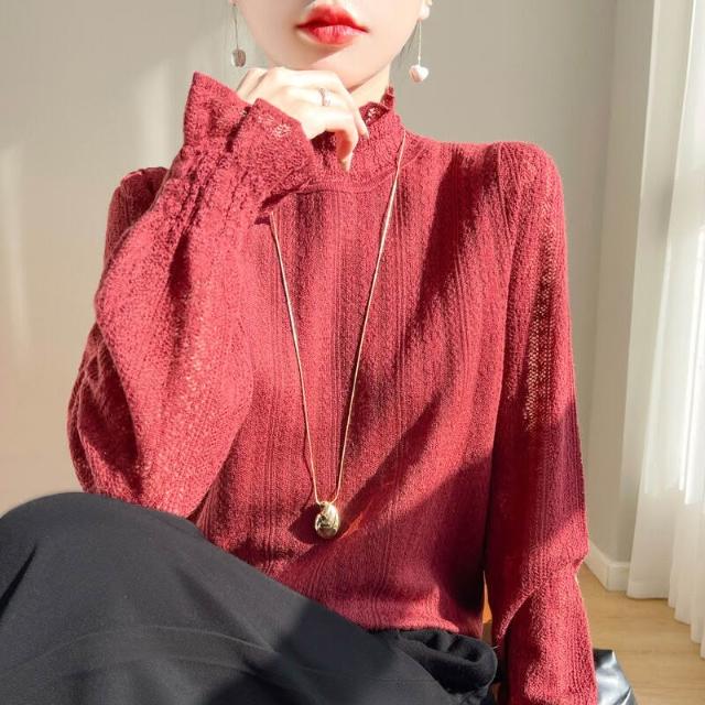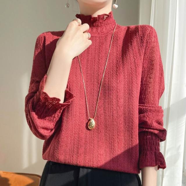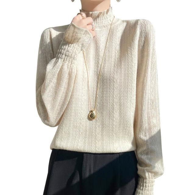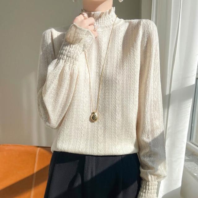 精紡蕾絲羊毛薄款打底衫女春秋新款半高領毛衣镂空根紗針織上衣