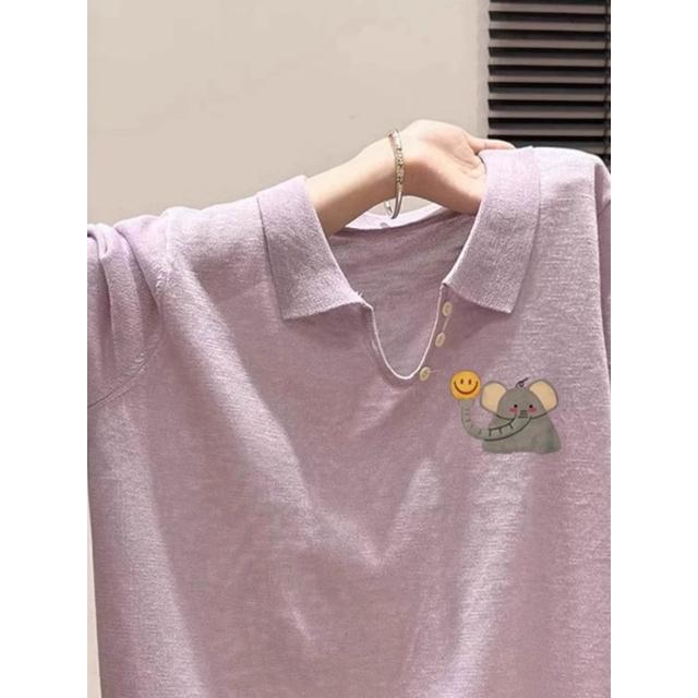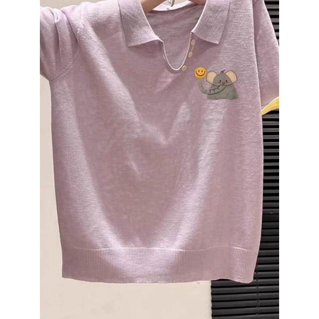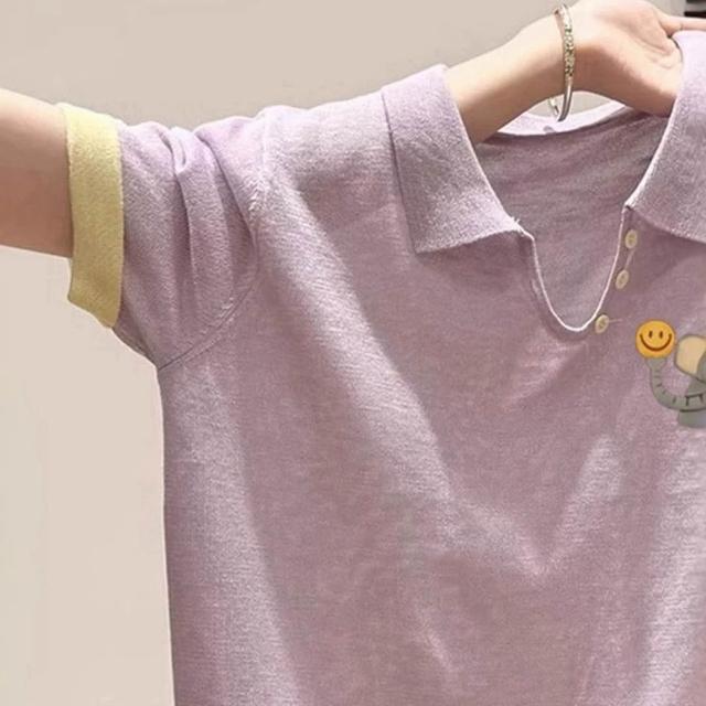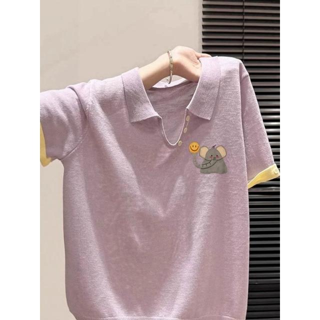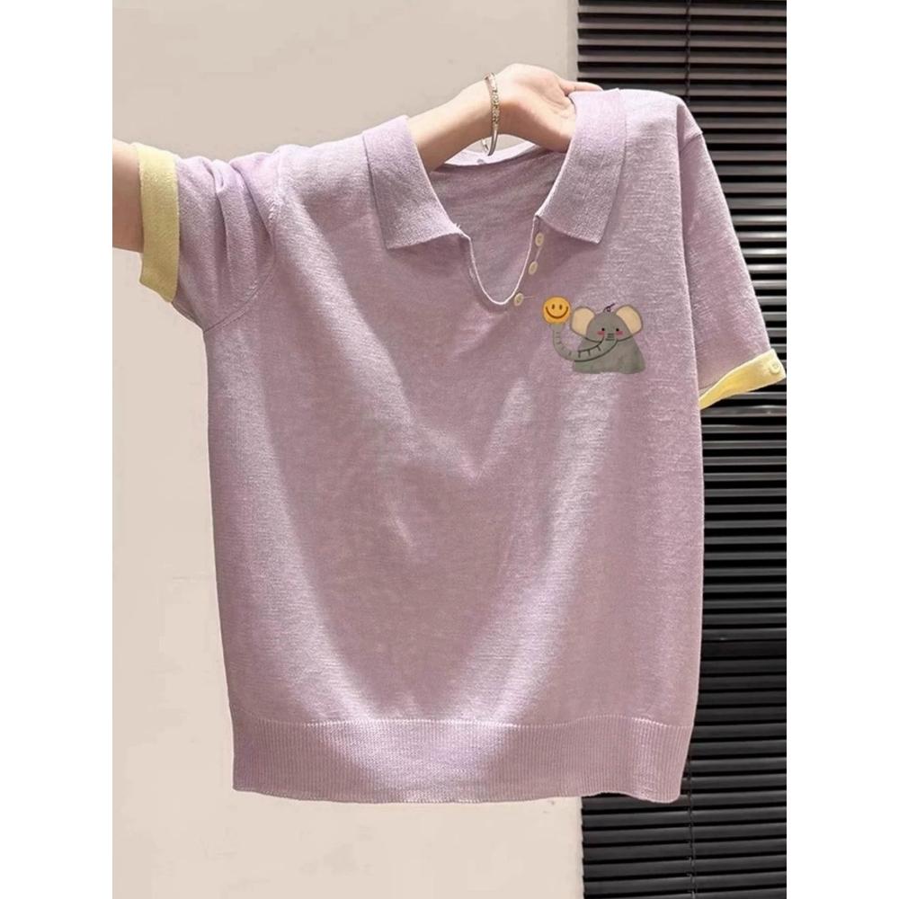 短袖 T 恤 寬松 T 恤 短袖上衣 紫色笑臉象印花翻領休閑百搭正肩短袖T恤女2025新款夏季韓系上衣 壹和軒