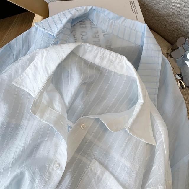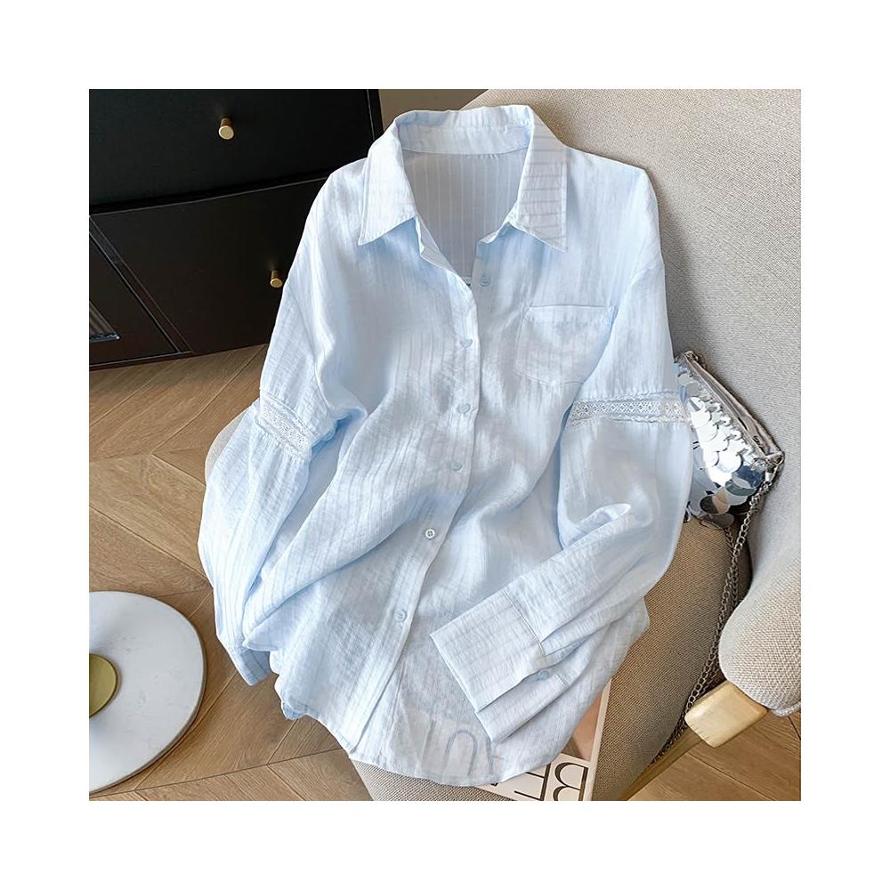 長袖防曬衫 镂空蕾絲拼接條紋防曬襯衫外套女2025夏寬松慵懶藍色襯衣長袖上衣 壹和軒