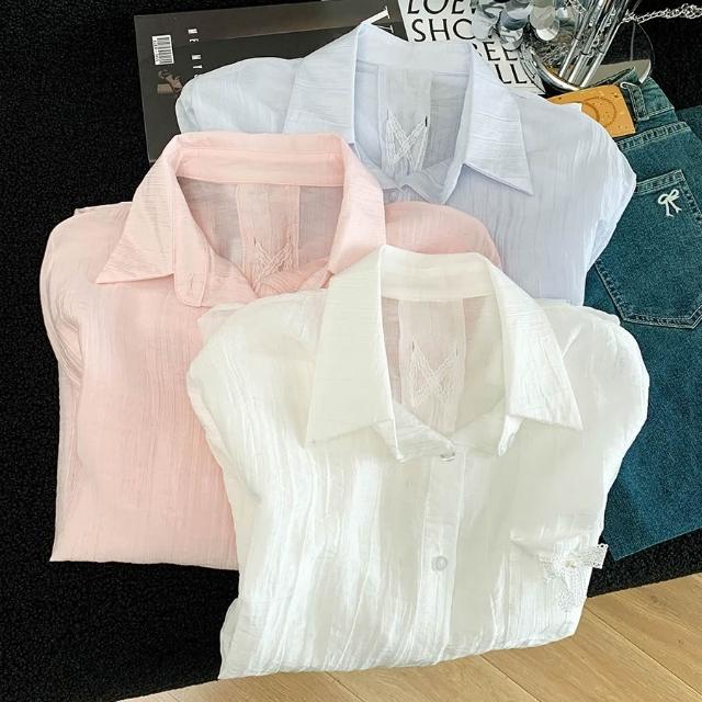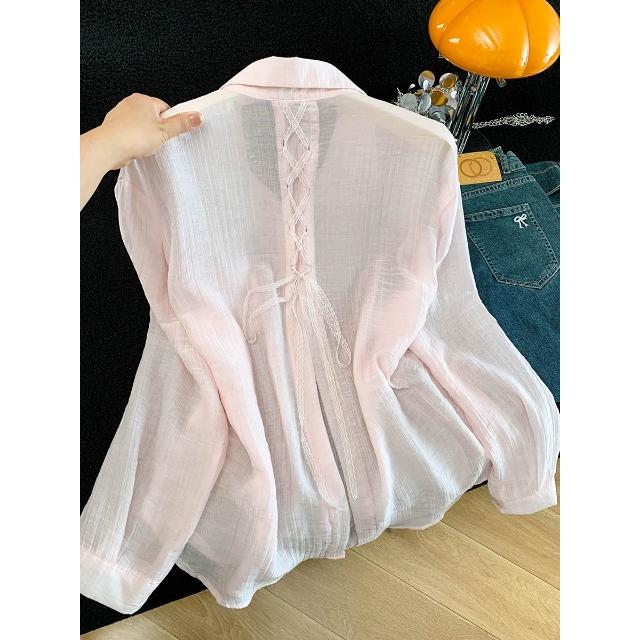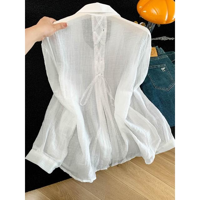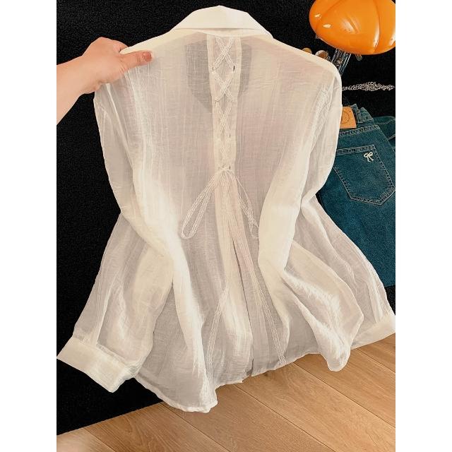 長袖防曬衫 藍色防曬襯衫女夏季顯瘦開衫外套蕾絲系帶設計感外搭上衣 壹和軒
