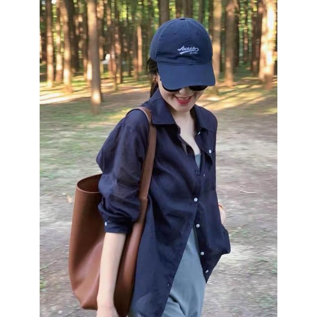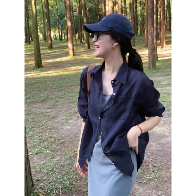 長袖防曬衫 法式藍色天絲亞麻防曬襯衫女夏季高級感氣質外套外搭薄款開衫上衣 壹和軒