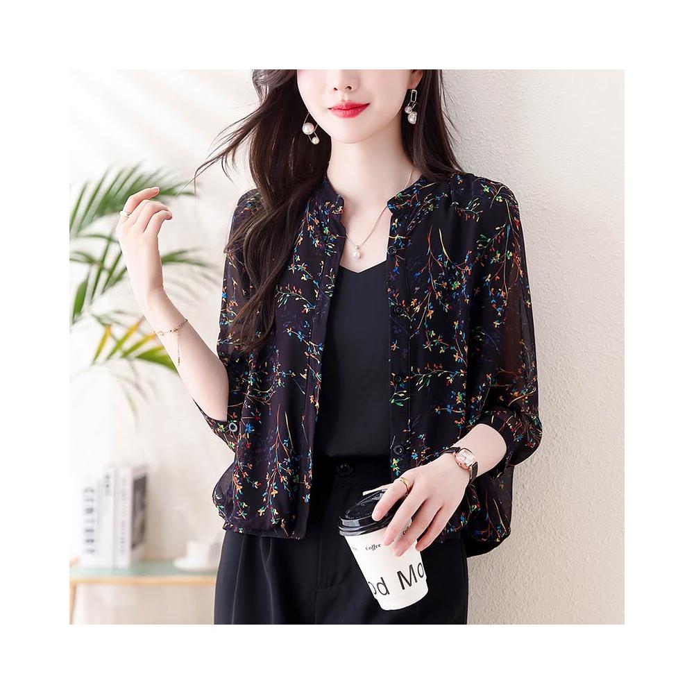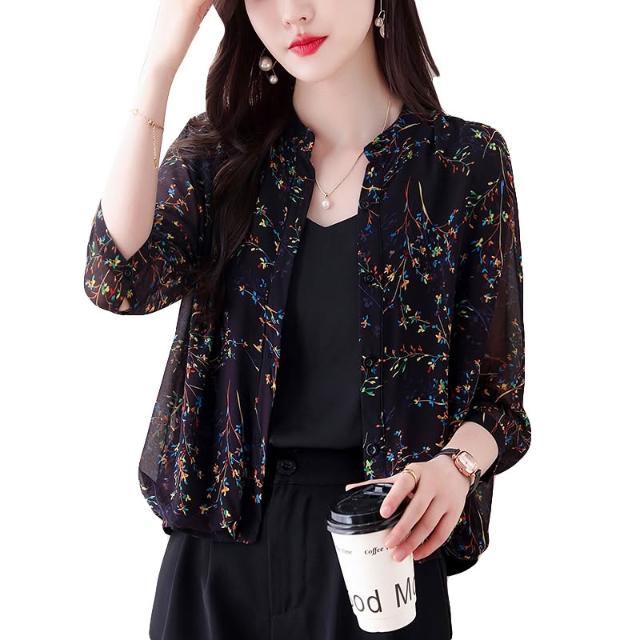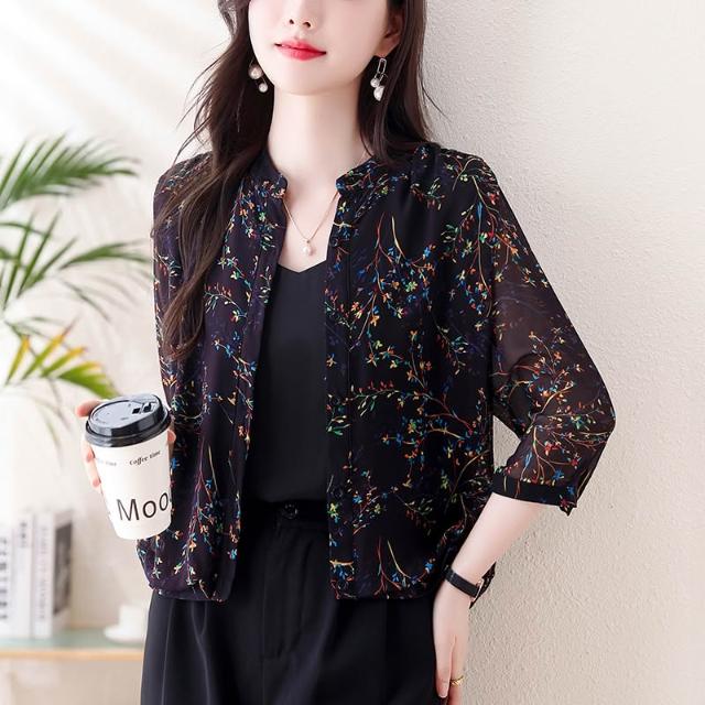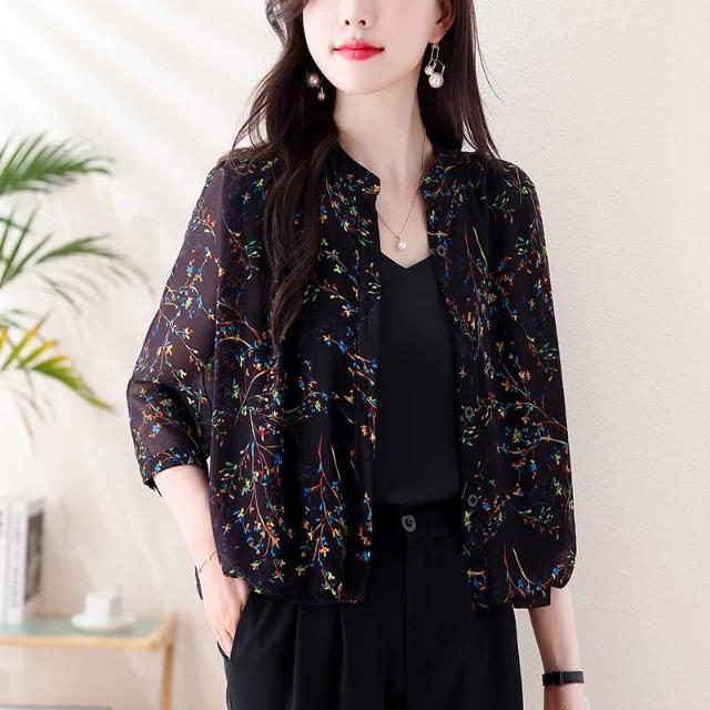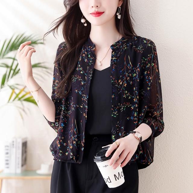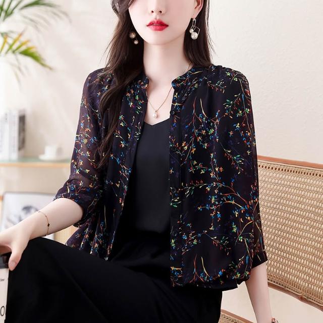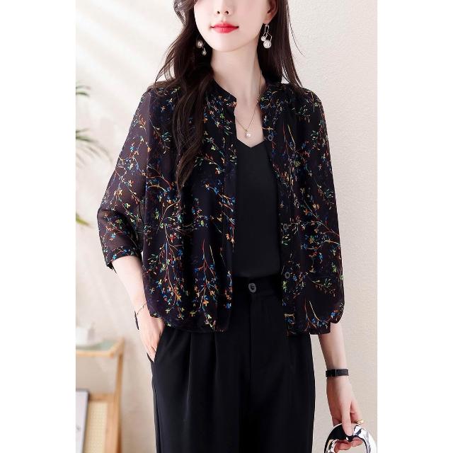 長袖防曬衫 防曬衣短外套女2024新款夏季真絲外搭小開衫媽媽碎花上衣薄 壹和軒