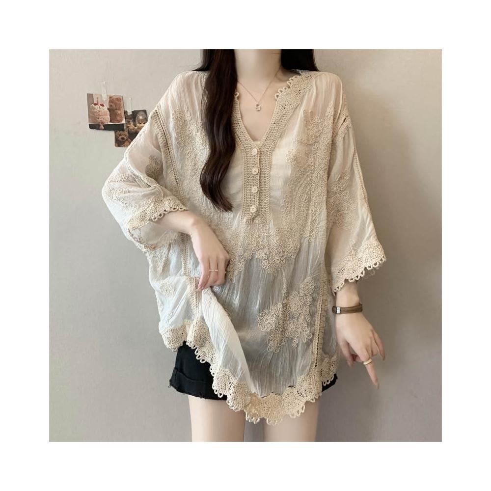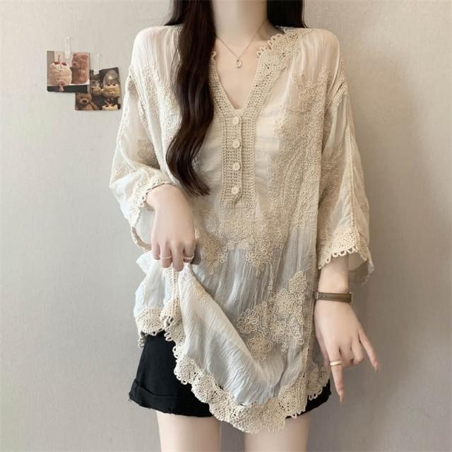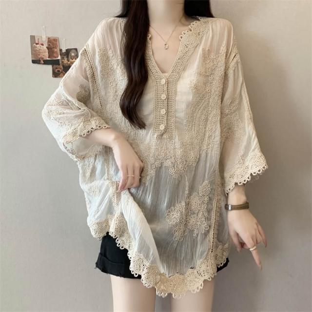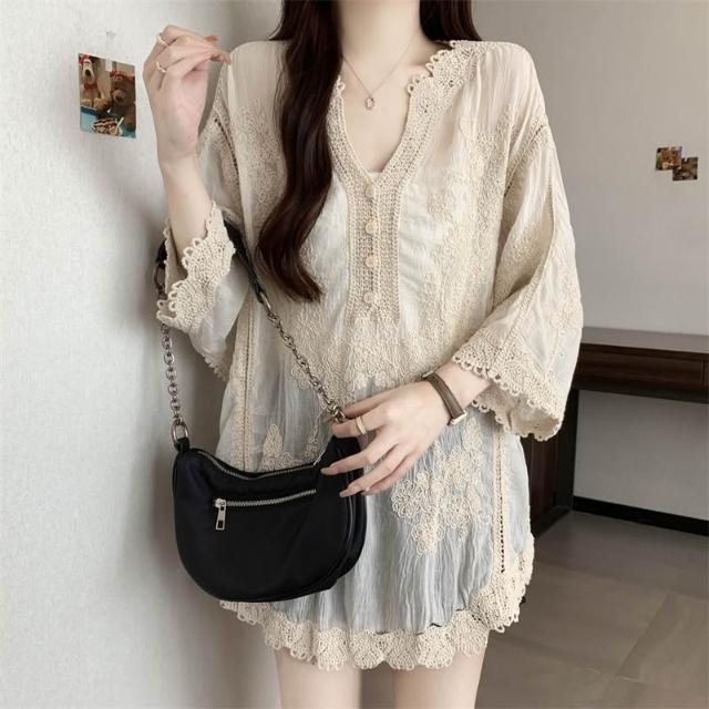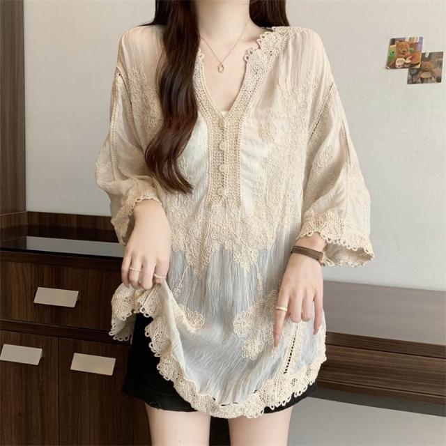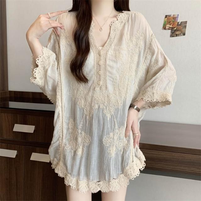 長袖防曬衫 實拍~大碼刺繡镂空蕾絲襯衫女夏季顯瘦時尚百搭防曬外套罩衫上衣 壹和軒