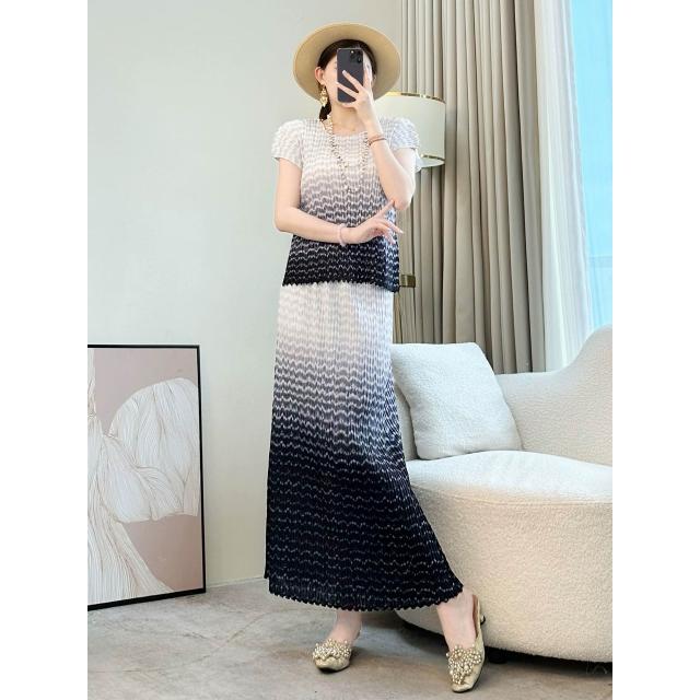 大碼連衣裙 顯瘦長裙 漸變色褶皺套裝裙女夏季媽媽2025新款高端氣質休閑穿搭裙子兩件套 壹和軒