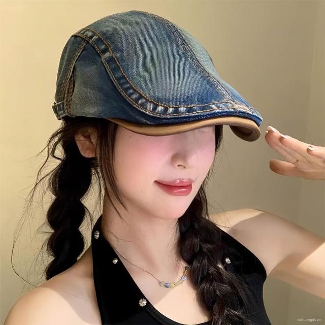2025夏複古水洗牛仔前進帽女春夏百搭大頭圍顯臉小英倫風貝雷帽子熱賣