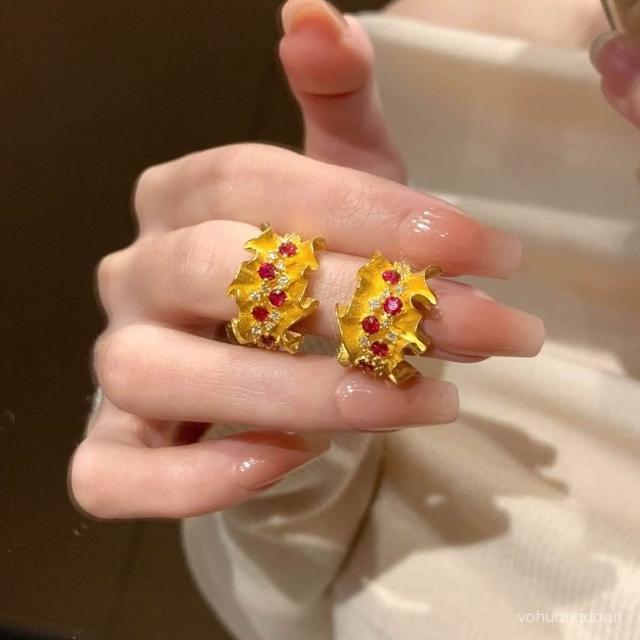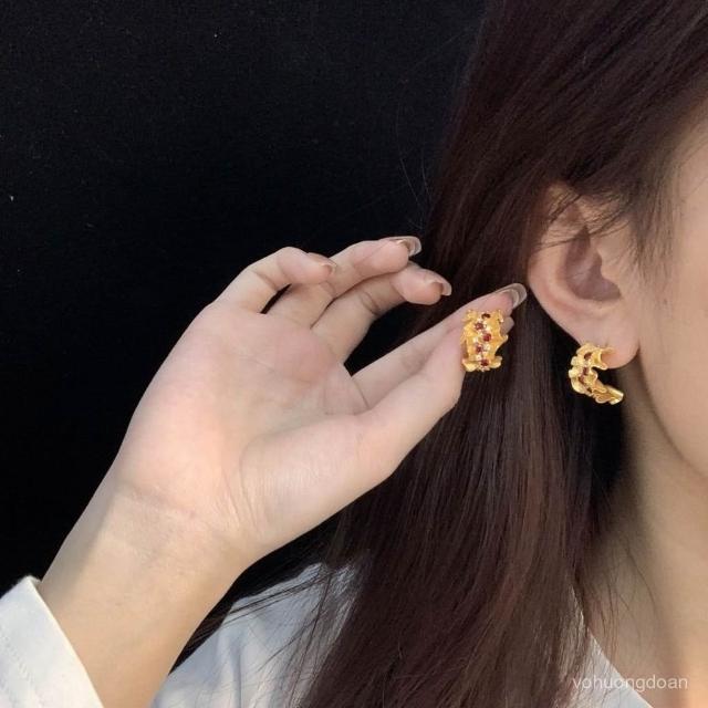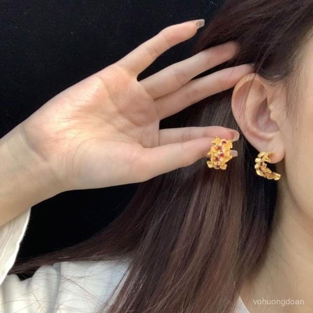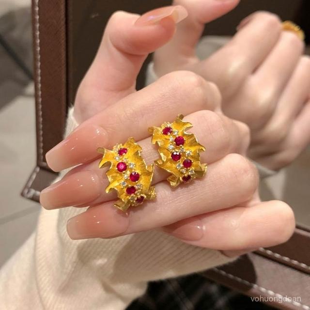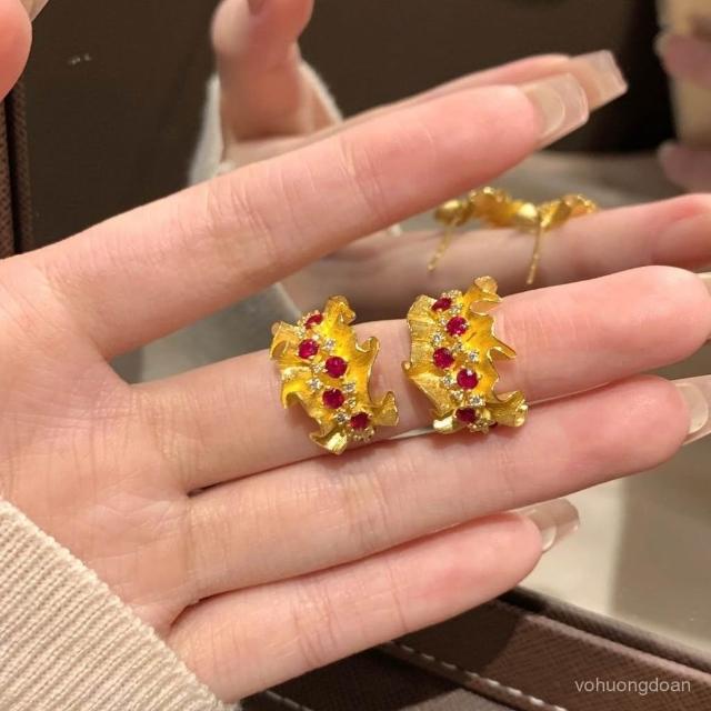 法式複古微鑲鑽蕾絲耳釘女時尚輕奢高級感紅色寶石耳飾送老婆女友熱賣
