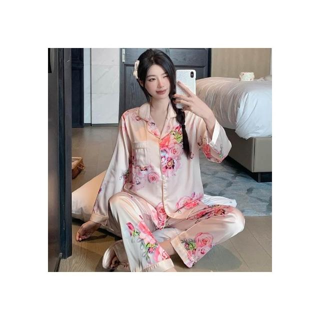 春秋長袖冰雪絲睡衣女高級感成熟女人花卉印花開衫外穿套裝