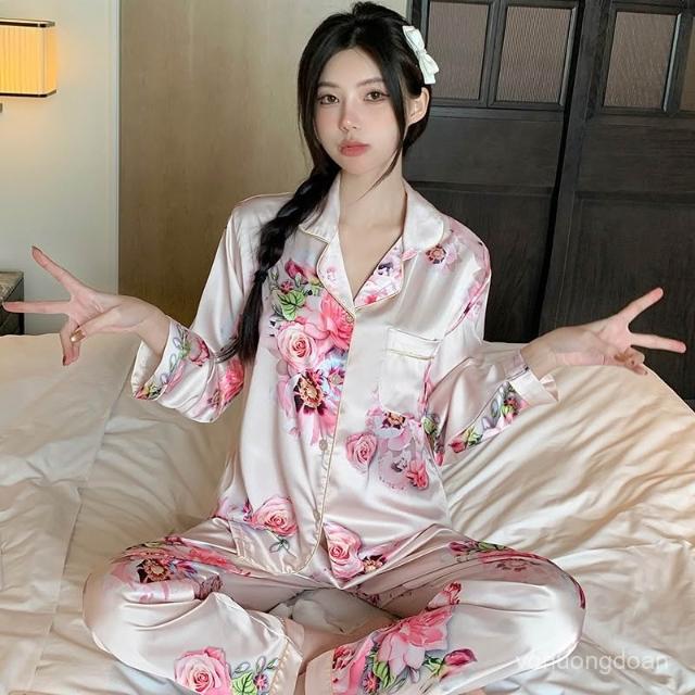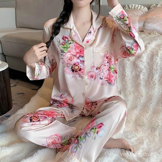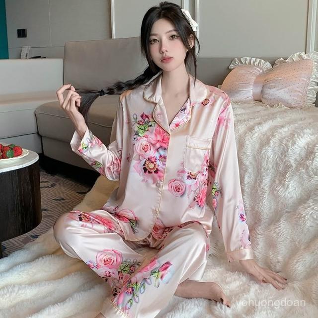 春秋長袖冰雪絲睡衣女高級感成熟女人花卉印花開衫外穿套裝
