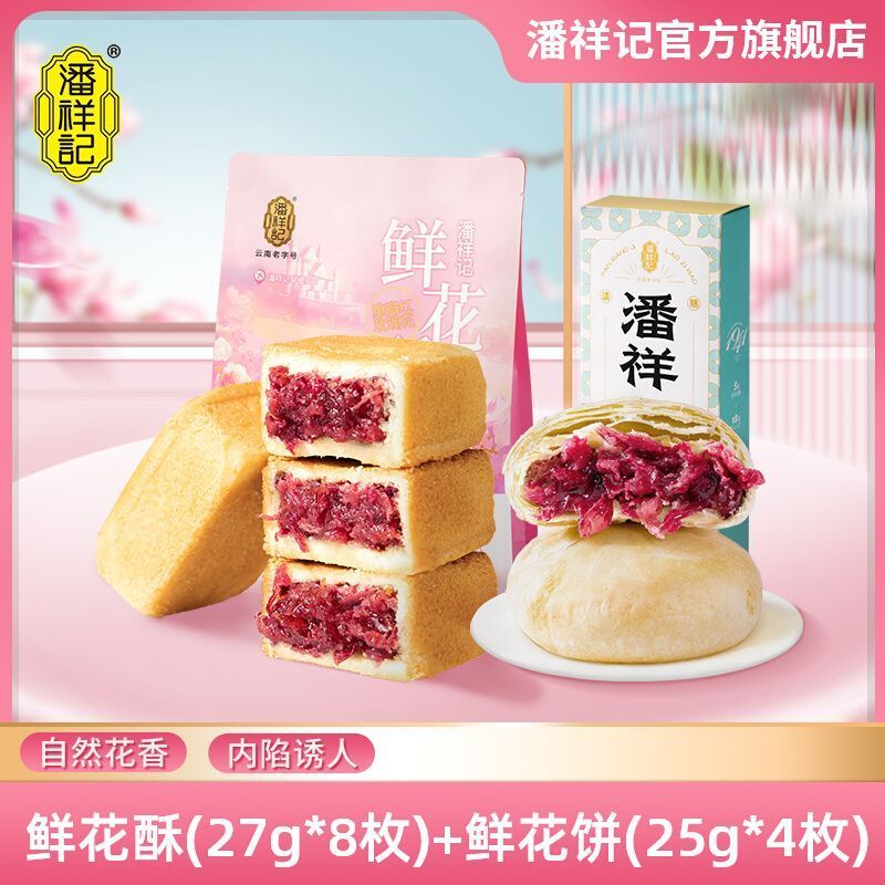 熱賣中潘祥記玫瑰酥鮮花餅216g普洱茶玫瑰夾心糕點早餐零食禮袋