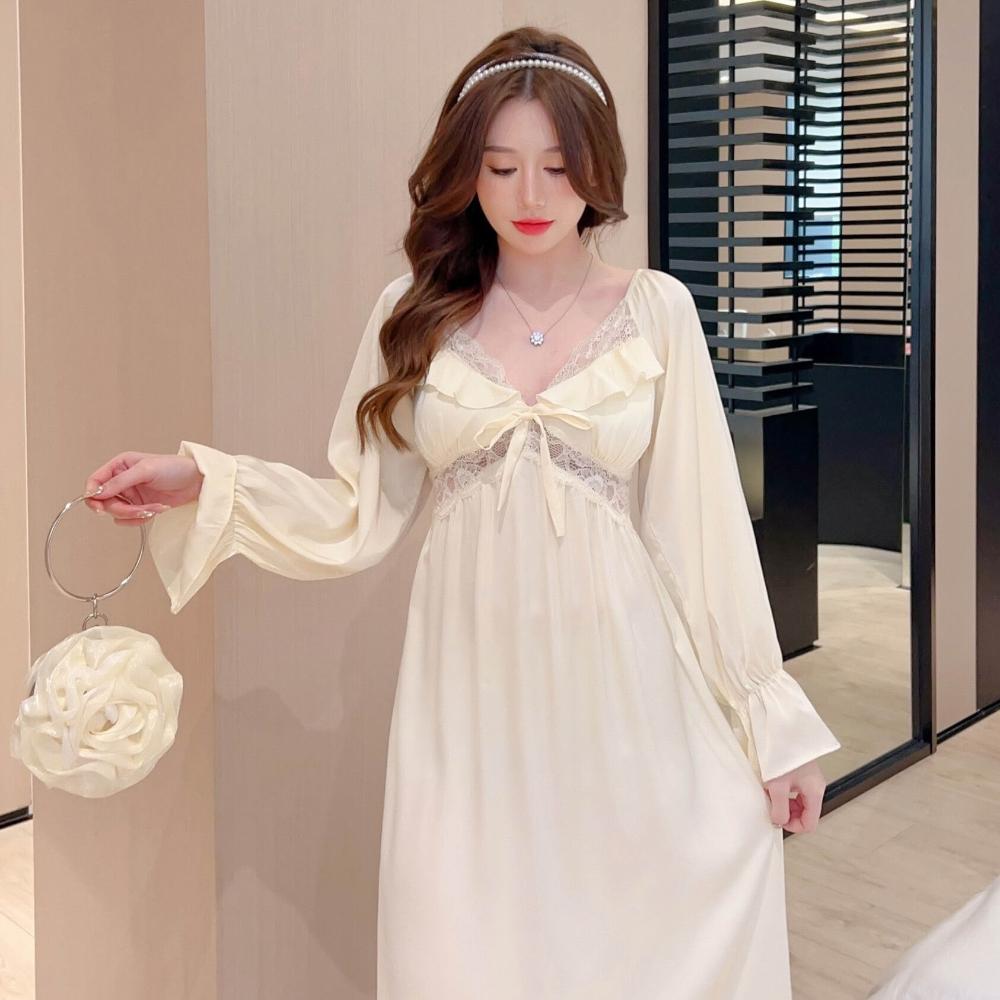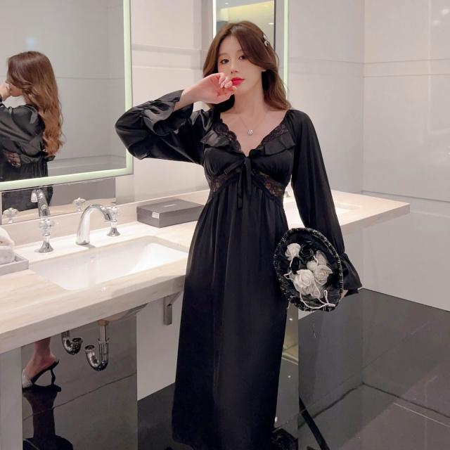 睡衣家居服 法式睡衣宮廷風長袖睡裙帶胸墊女春秋仿真絲家居服公主風冰絲睡裙
