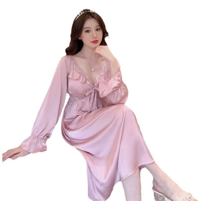 睡衣家居服 法式睡衣宮廷風長袖睡裙帶胸墊女春秋仿真絲家居服公主風冰絲睡裙