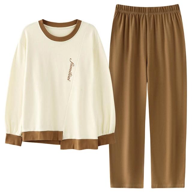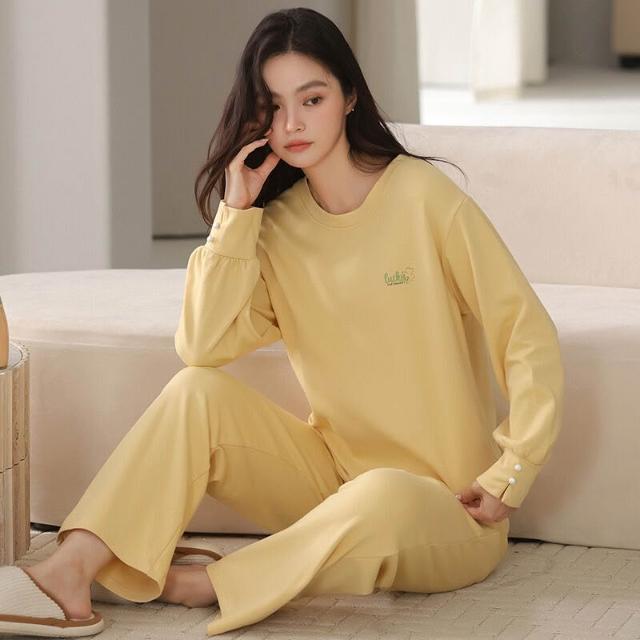 睡衣家居服 簡約休閑圓領長袖睡衣女春秋季50支雙面拉架棉可外穿寬松家居服