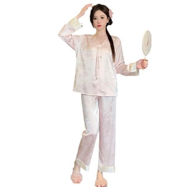 睡衣家居服 冰絲睡衣女夏季新中式國風復古盤扣套裝春秋高級感大碼長袖家居服