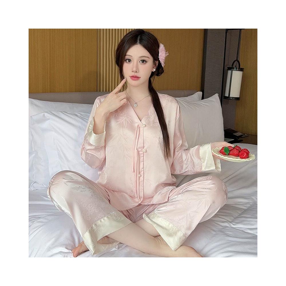 睡衣家居服 冰絲睡衣女夏季新中式國風復古盤扣套裝春秋高級感大碼長袖家居服