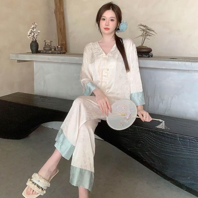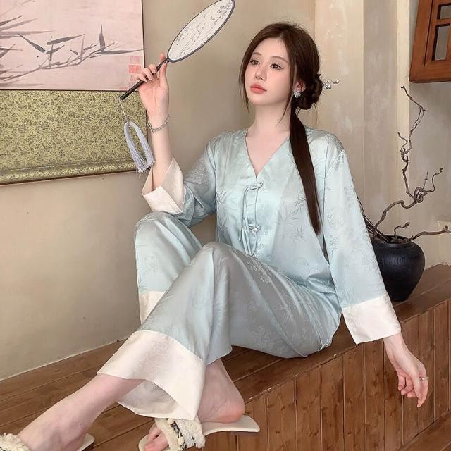 睡衣家居服 冰絲睡衣女夏季新中式國風復古盤扣套裝春秋高級感大碼長袖家居服
